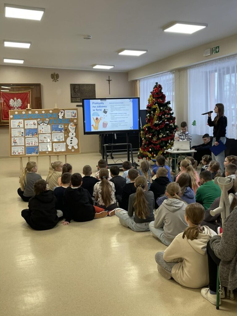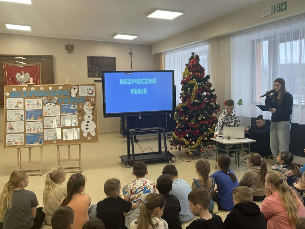 Dodatkowo Samorząd Uczniowski przygotował gazetkę tematyczną na szkolnym korytarzu, w której umieszczono najważniejsze zasady bezpiecznych ferii zimowych. Uczniowie podczas przerw mogli utrwalać zdobytą wiedzę, czytając zamieszczone informacje i oglądając przygotowane plakaty.