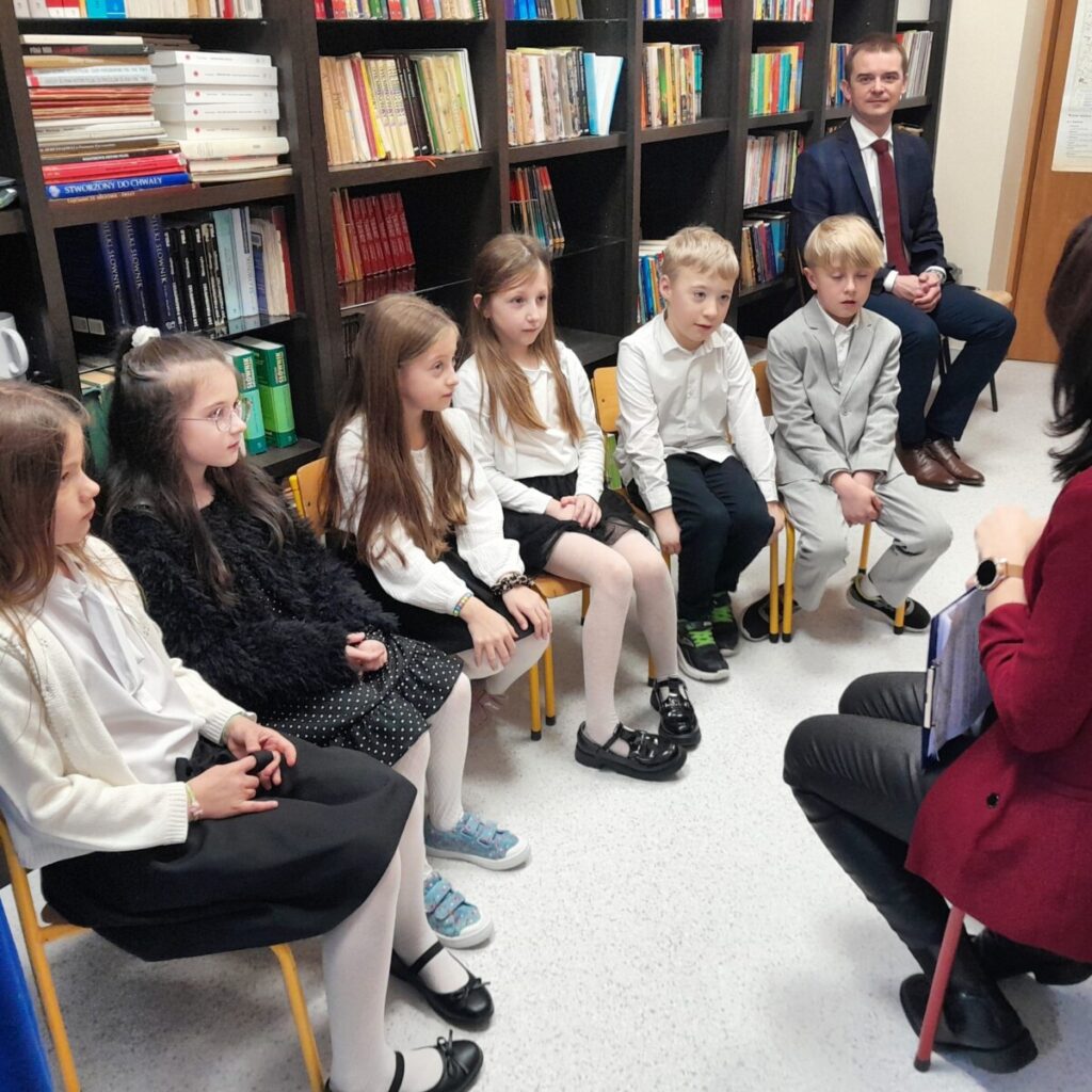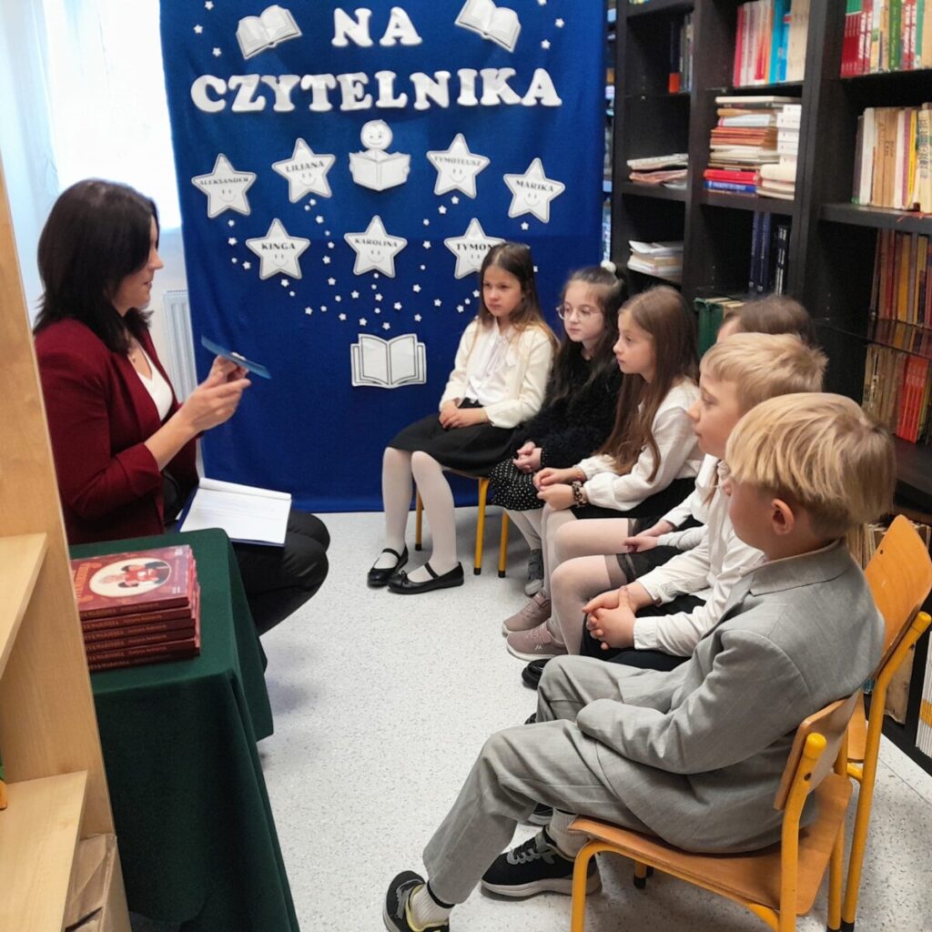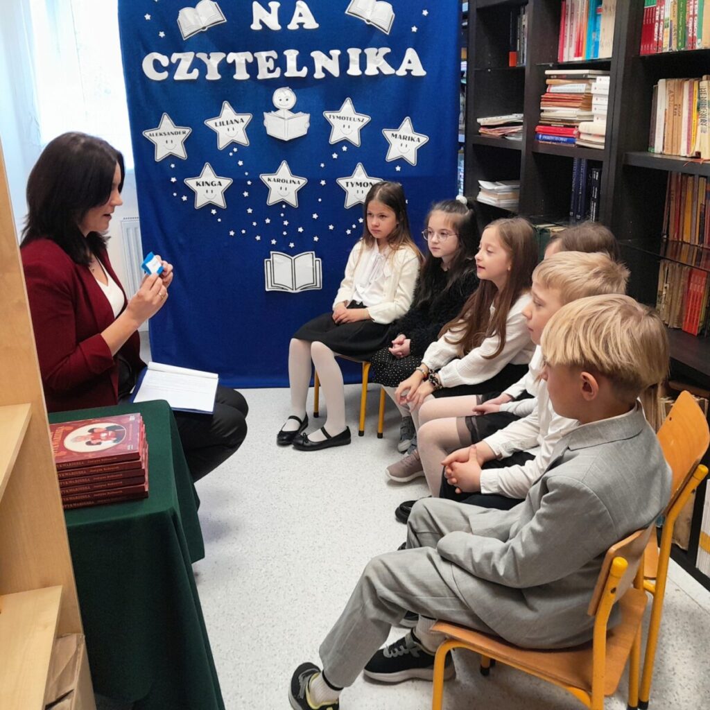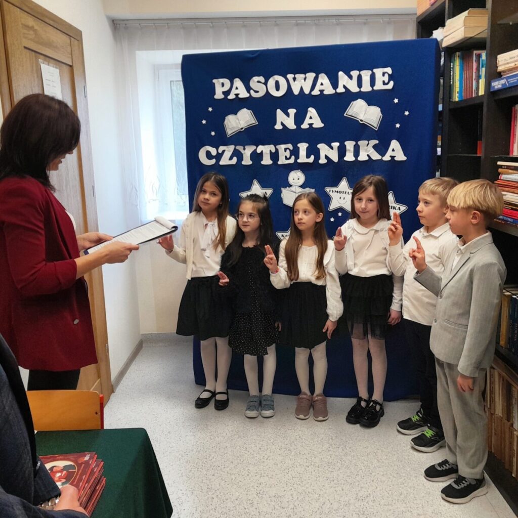 W dniu 25 lutego 2026 roku w naszej szkole odbyło się wyjątkowe wydarzenie – uroczyste pasowanie uczniów klasy pierwszej na czytelników biblioteki szkolnej. Spotkanie miało miejsce w bibliotece, a swoją obecnością uświetnili je Dyrektor Szkoły p. Piotr Piasecki, wychowawczyni klasy p. Barbara Czaja oraz nauczycielka współorganizująca kształcenie p. Natalia Grabowska – Dernoga. Uroczystość rozpoczęła się od wspólnej rozmowy, podczas której uczniowie opowiadali o tym, jaką rolę odgrywają książki w ich codziennym życiu oraz dlaczego warto po nie sięgać każdego dnia. Następnie pierwszoklasiści wzięli udział w zabawach sprawdzających ich wiedzę o bajkach i baśniach, udowadniając, że doskonale znają losy swoich ulubionych bohaterów. Po części pełnej zagadek i uśmiechu nadszedł najważniejszy moment spotkania – złożenie uroczystego ślubowania, w którym pierwszoklasiści obiecali dbać o książki i być wzorowymi czytelnikami. Po złożeniu obietnicy głos zabrał Dyrektor Szkoły, który skierował do uczniów ciepłe słowa, gratulując im rozpoczęcia tej niezwykłej przygody z czytaniem. Na pamiątkę tego ważnego dnia każdy uczeń otrzymał dyplom oraz książkę „Wnuczka antykwariusza” autorstwa Justyny Bednarek, wręczoną w ramach ogólnopolskiej akcji „Mała książka – wielki człowiek”. Dodatkowo uczniowie zostali obdarowani kolorowymi zakładkami, przygotowanymi specjalnie na tę okazję przez p. Paulinę Wróbel – nauczyciela bibliotekarza. Mamy nadzieję, że zapał do czytania, który towarzyszył uczniom podczas dzisiejszego spotkania, pozostanie z nimi na bardzo długo. Drodzy Pierwszoklasiści! Niech czytanie stanie się dla Was wielką frajdą, a biblioteka miejscem, do którego zawsze wracacie z uśmiechem. Biblioteka czeka na Was na każdej przerwie – odkrywajcie, wybierajcie i zaczytujcie się bez końca!