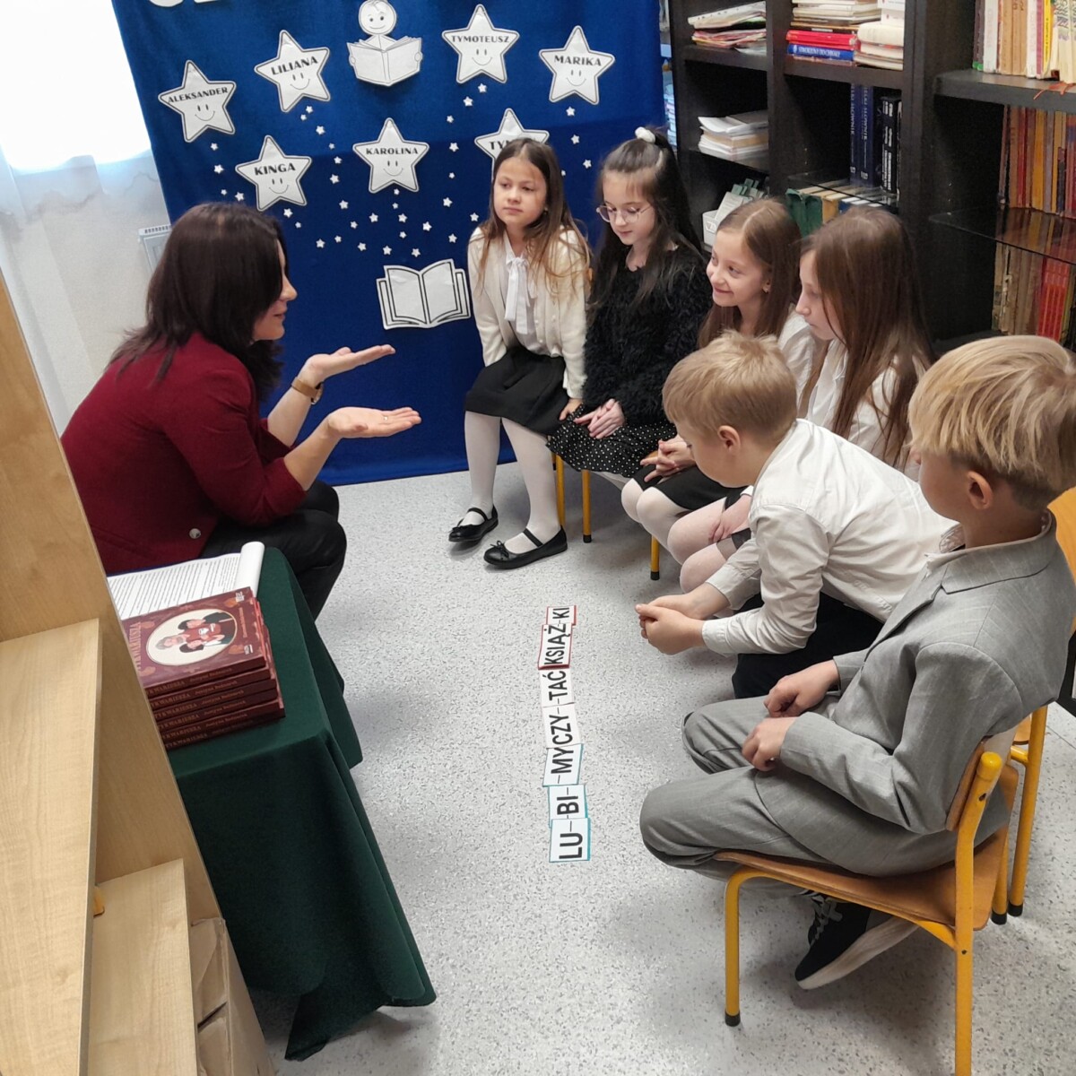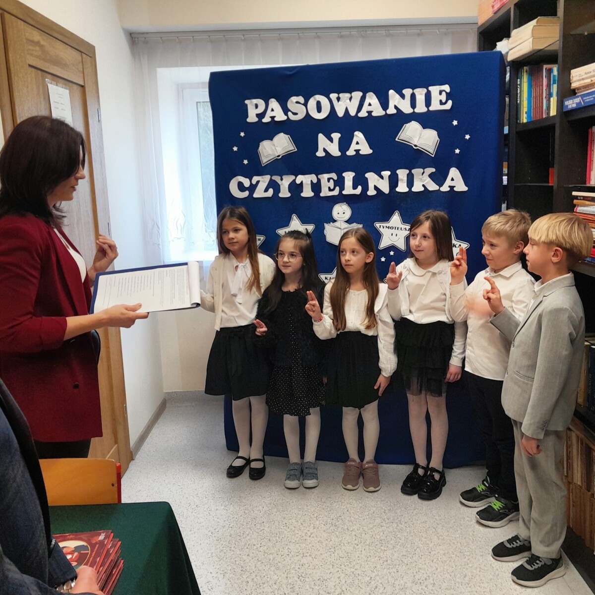 W dniu 25 lutego 2026 roku w naszej szkole odbyło się wyjątkowe wydarzenie – uroczyste pasowanie uczniów klasy pierwszej na czytelników biblioteki szkolnej. Spotkanie miało miejsce w bibliotece, a swoją obecnością uświetnili je Dyrektor Szkoły p. Piotr Piasecki, wychowawczyni klasy p. Barbara Czaja oraz nauczycielka współorganizująca kształcenie p. Natalia Grabowska – Dernoga. Uroczystość rozpoczęła się od wspólnej rozmowy, podczas której uczniowie opowiadali o tym, jaką rolę odgrywają książki w ich codziennym życiu oraz dlaczego warto po nie sięgać każdego dnia. Następnie pierwszoklasiści wzięli udział w zabawach sprawdzających ich wiedzę o bajkach i baśniach, udowadniając, że doskonale znają losy swoich ulubionych bohaterów. Po części pełnej zagadek i uśmiechu nadszedł najważniejszy moment spotkania – złożenie uroczystego ślubowania, w którym pierwszoklasiści obiecali dbać o książki i być wzorowymi czytelnikami. Po złożeniu obietnicy głos zabrał Dyrektor Szkoły, który skierował do uczniów ciepłe słowa, gratulując im rozpoczęcia tej niezwykłej przygody z czytaniem. Na pamiątkę tego ważnego dnia każdy uczeń otrzymał dyplom oraz książkę „Wnuczka antykwariusza” autorstwa Justyny Bednarek, wręczoną w ramach ogólnopolskiej akcji „Mała książka – wielki człowiek”. Dodatkowo uczniowie zostali obdarowani kolorowymi zakładkami, przygotowanymi specjalnie na tę okazję przez p. Paulinę Wróbel – nauczyciela bibliotekarza. Mamy nadzieję, że zapał do czytania, który towarzyszył uczniom podczas dzisiejszego spotkania, pozostanie z nimi na bardzo długo. Drodzy Pierwszoklasiści! Niech czytanie stanie się dla Was wielką frajdą, a biblioteka miejscem, do którego zawsze wracacie z uśmiechem. Biblioteka czeka na Was na każdej przerwie – odkrywajcie, wybierajcie i zaczytujcie się bez końca!