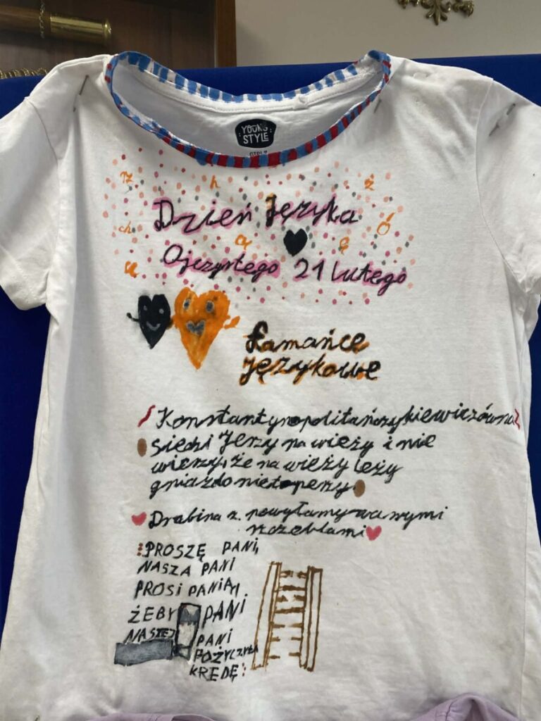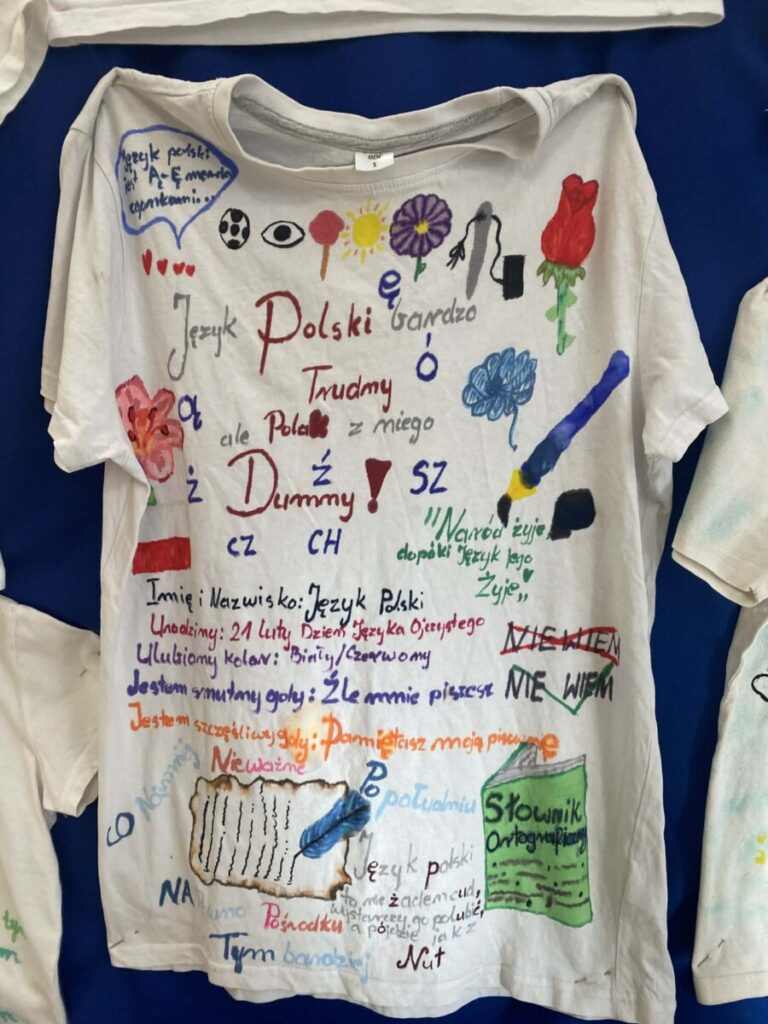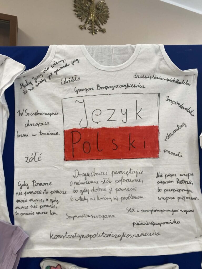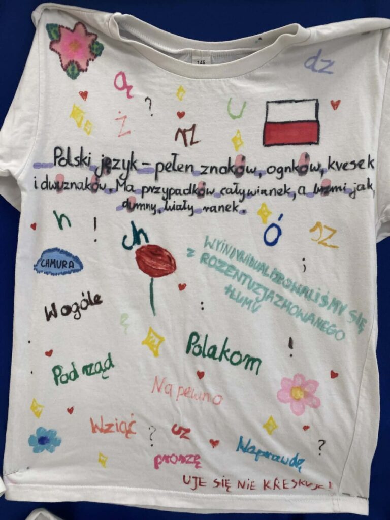 Dużym zainteresowaniem cieszyło się również zadanie polegające na przygotowaniu kreatywnych koszulek promujących język polski. Uczniowie wykazali się ogromną pomysłowością i poczuciem humoru, tworząc oryginalne hasła oraz grafiki związane z językiem ojczystym.