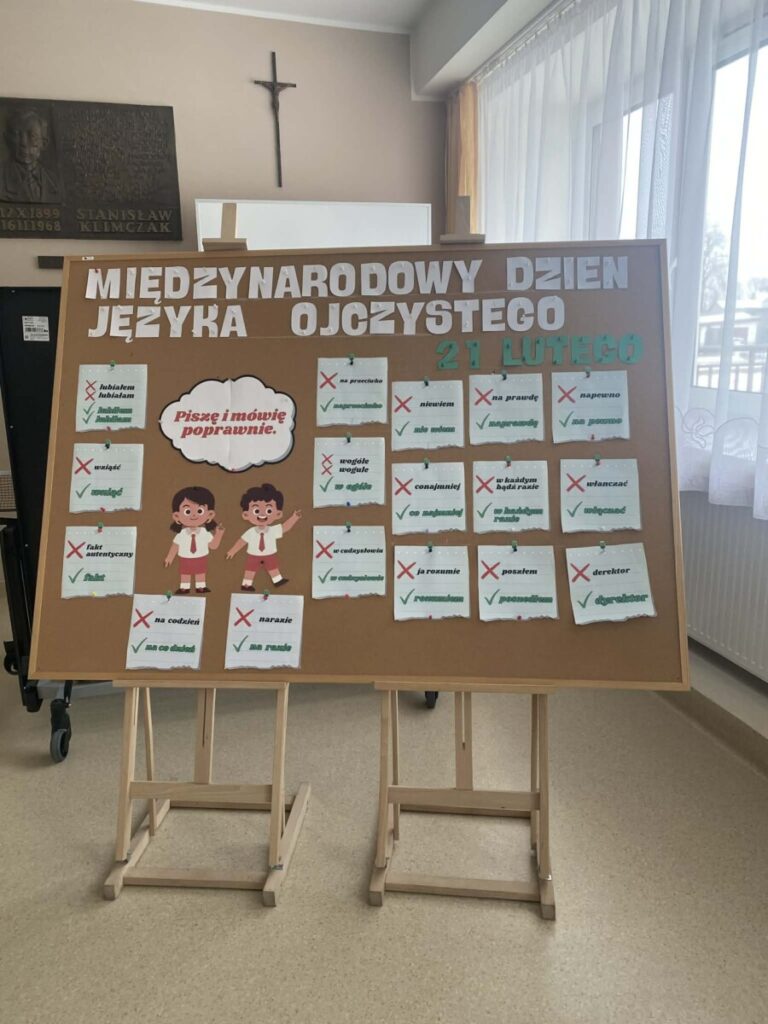 Dodatkowo na szkolnym korytarzu pojawiła się tematyczna gazetka przygotowana przez nauczyciela języka polskiego, która dotyczyła poprawności językowej w codziennym życiu i zwracała uwagę na najczęściej popełniane błędy językowe.