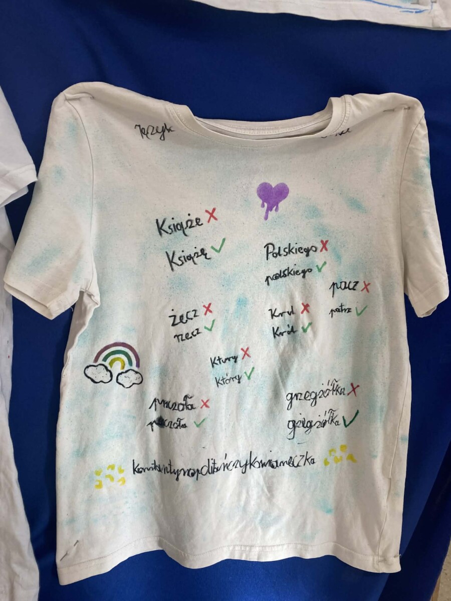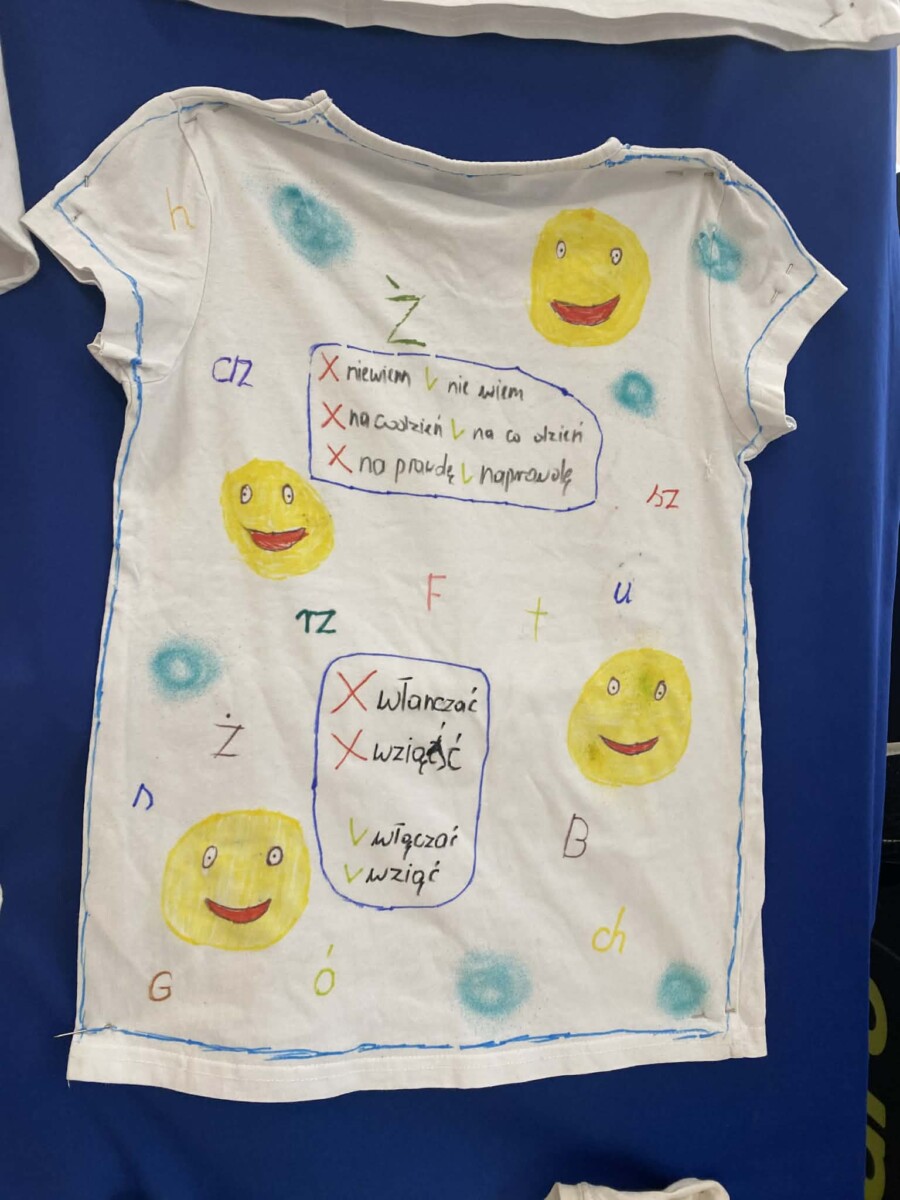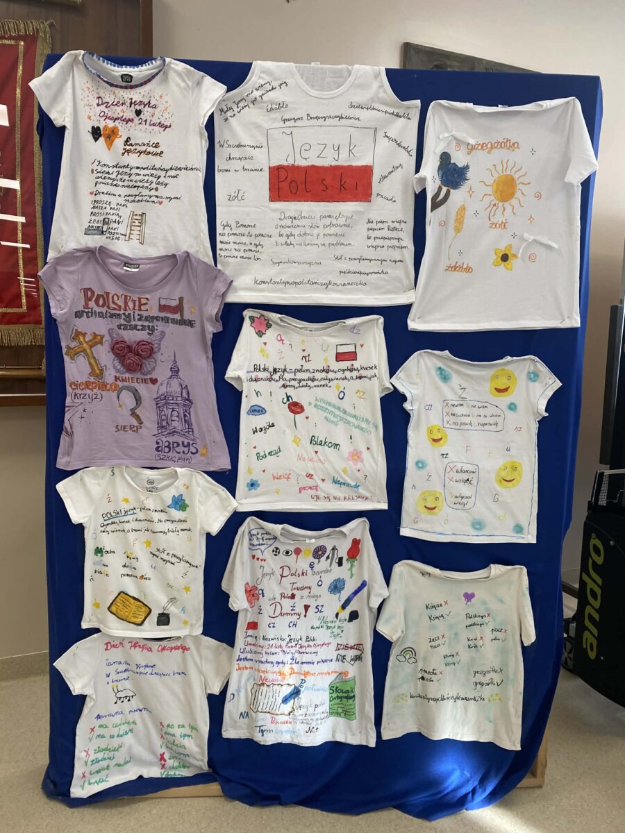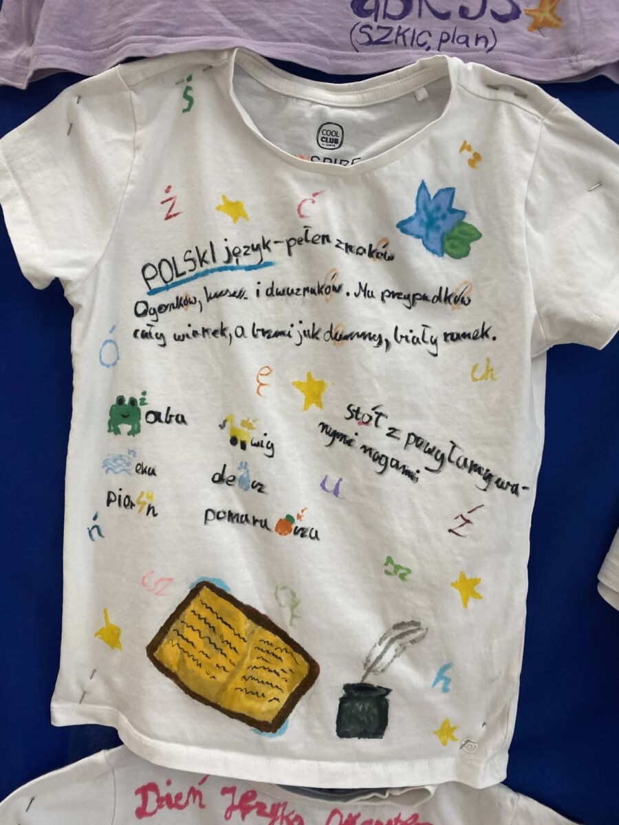 Dużym zainteresowaniem cieszyło się również zadanie polegające na przygotowaniu kreatywnych koszulek promujących język polski. Uczniowie wykazali się ogromną pomysłowością i poczuciem humoru, tworząc oryginalne hasła oraz grafiki związane z językiem ojczystym.