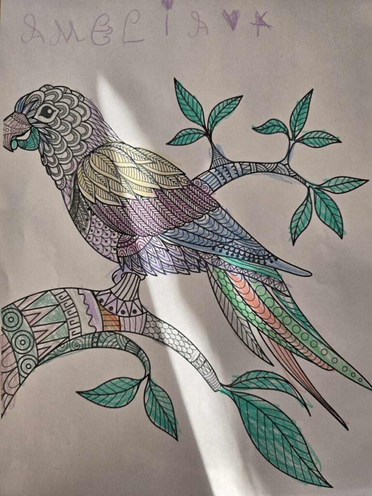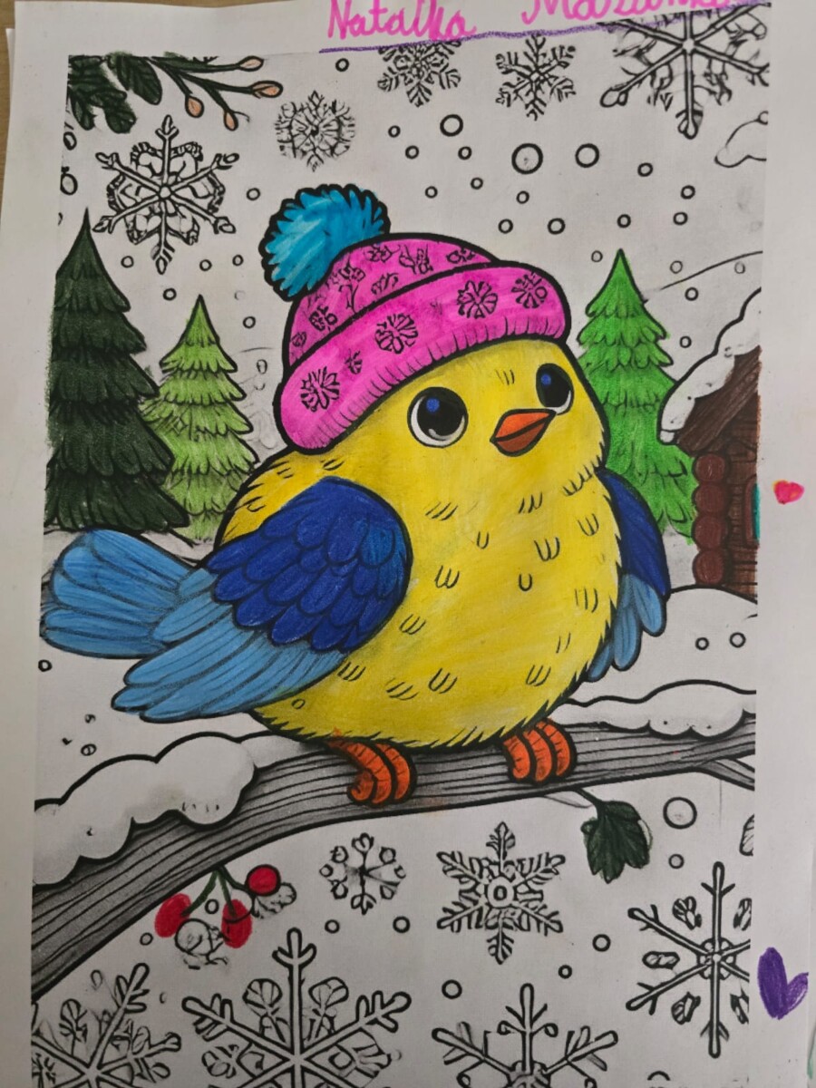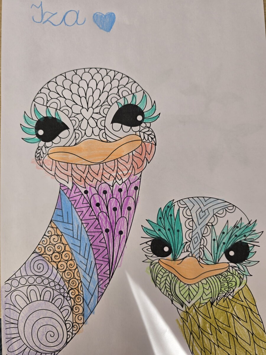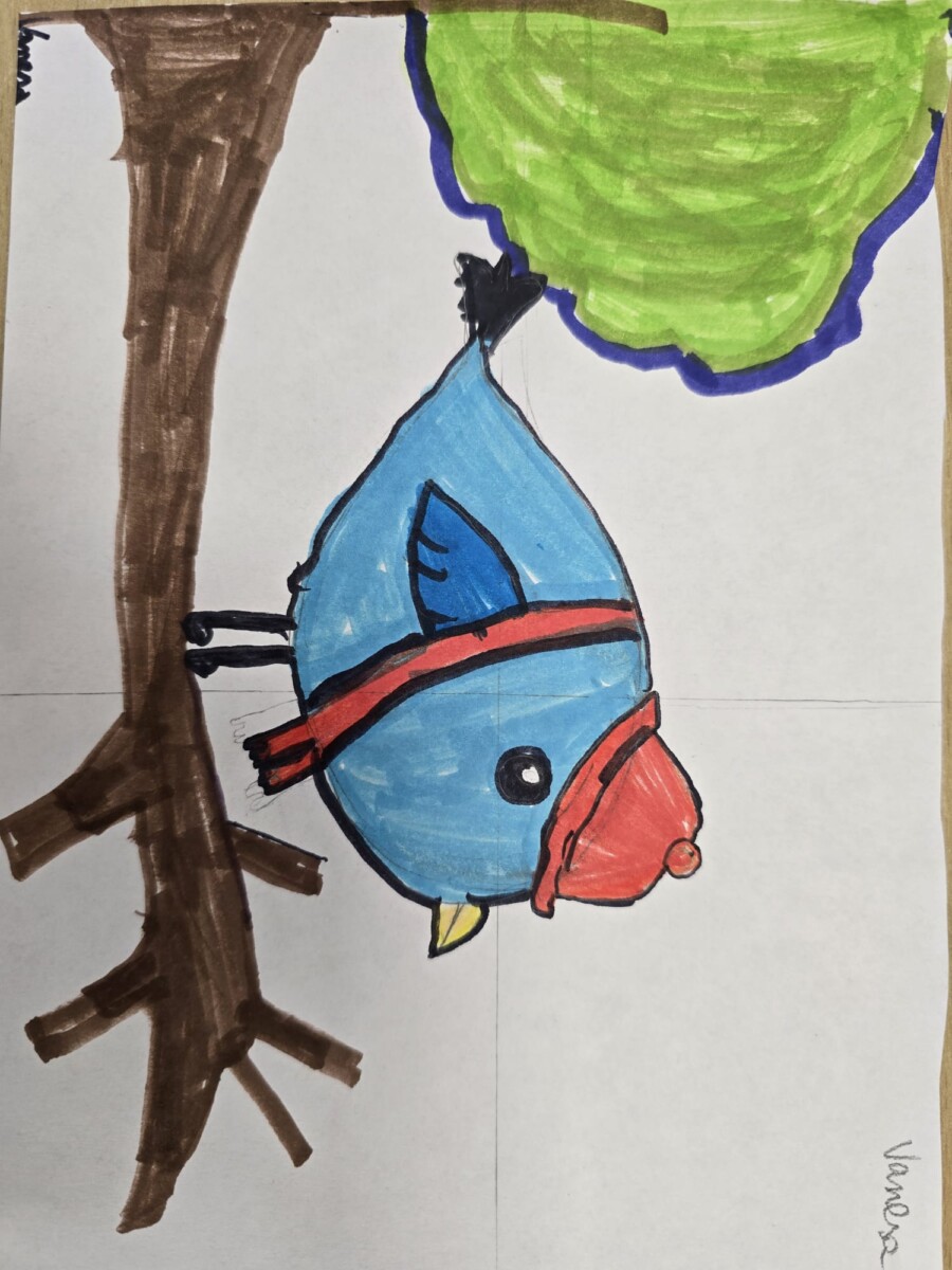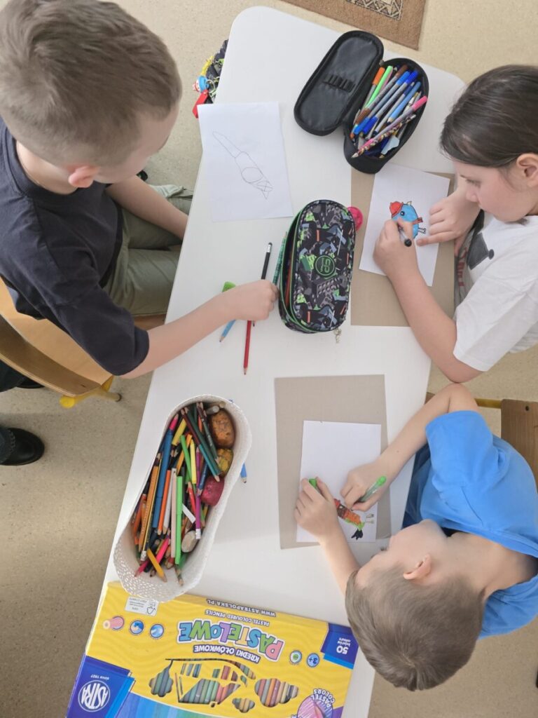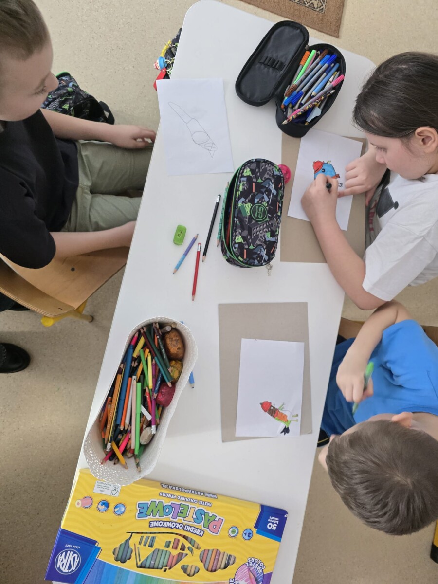 Na zakończenie zajęć uczniowie nauczyli się, jak narysować ptaka krok po kroku. Każdy mógł pokolorować swoją pracę według własnej inwencji twórczej. Powstały piękne i pomysłowe rysunki.