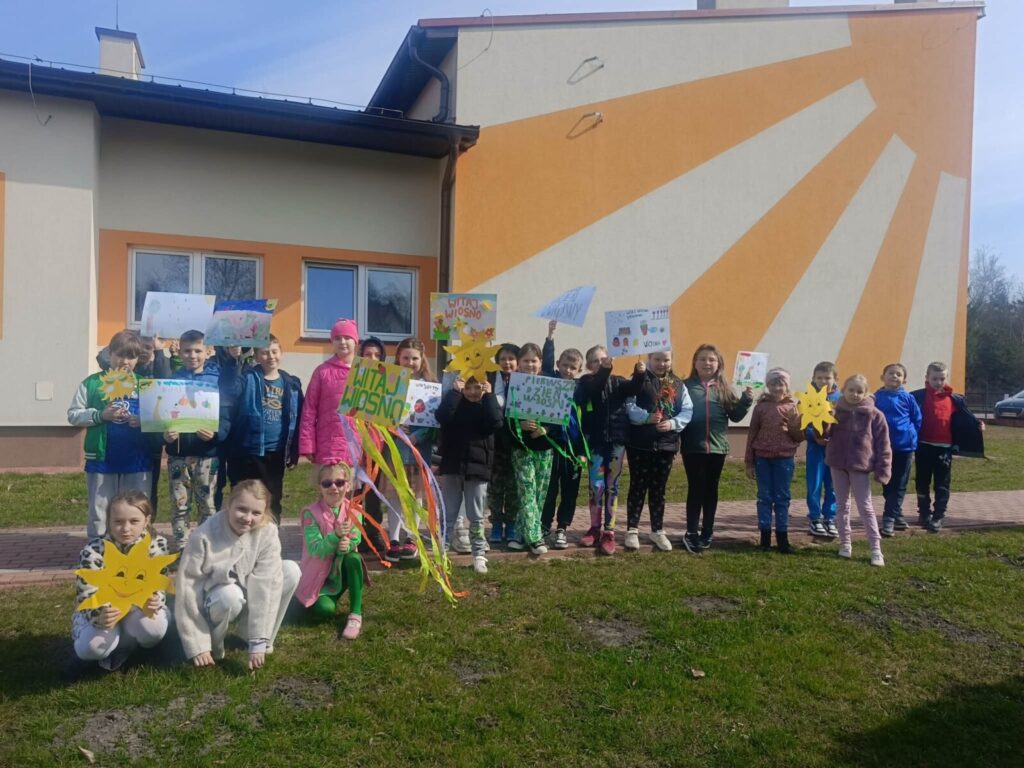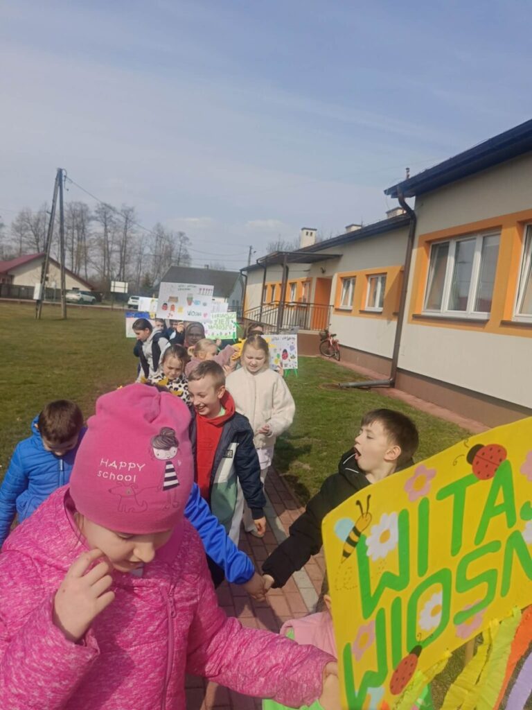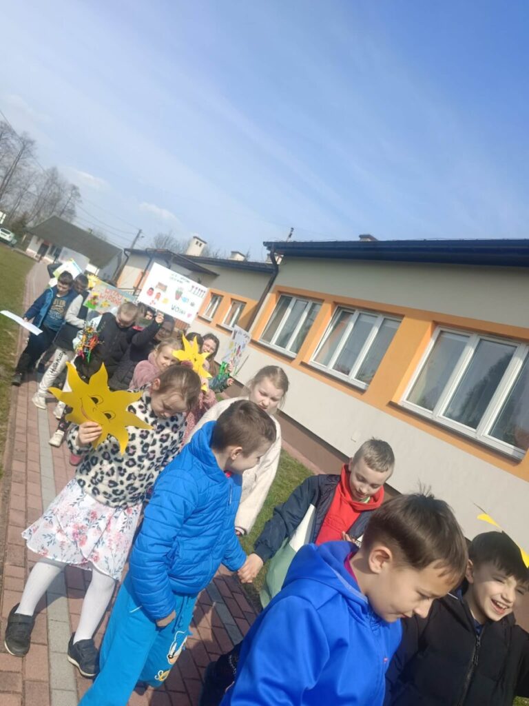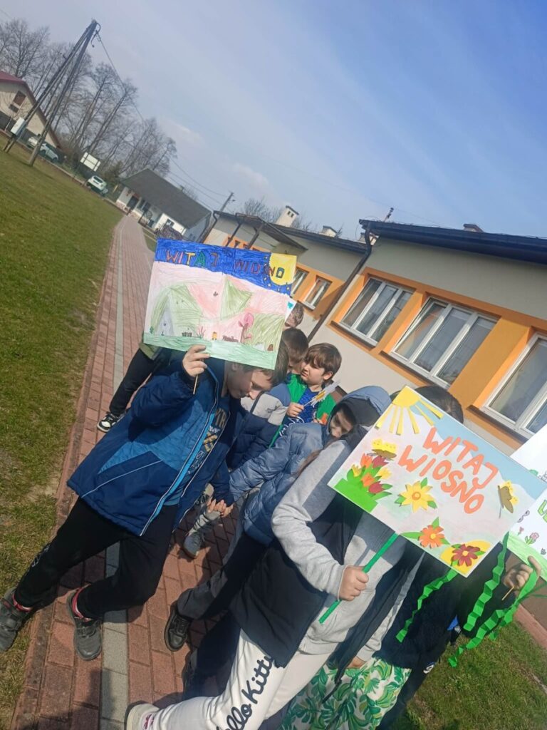 Na zakończenie tego wyjątkowego dnia wszyscy uczniowie wzięli udział we wspólnym spacerze z kolorowymi transparentami z hasłem „Witaj wiosno!”. Uczniowie szukali na spacerze pierwszych oznak wiosny. Był to piękny i radosny finał pełen uśmiechów, który na długo pozostanie w naszej pamięci jako dzień integracji i wspólnego świętowania nadejścia wiosny.