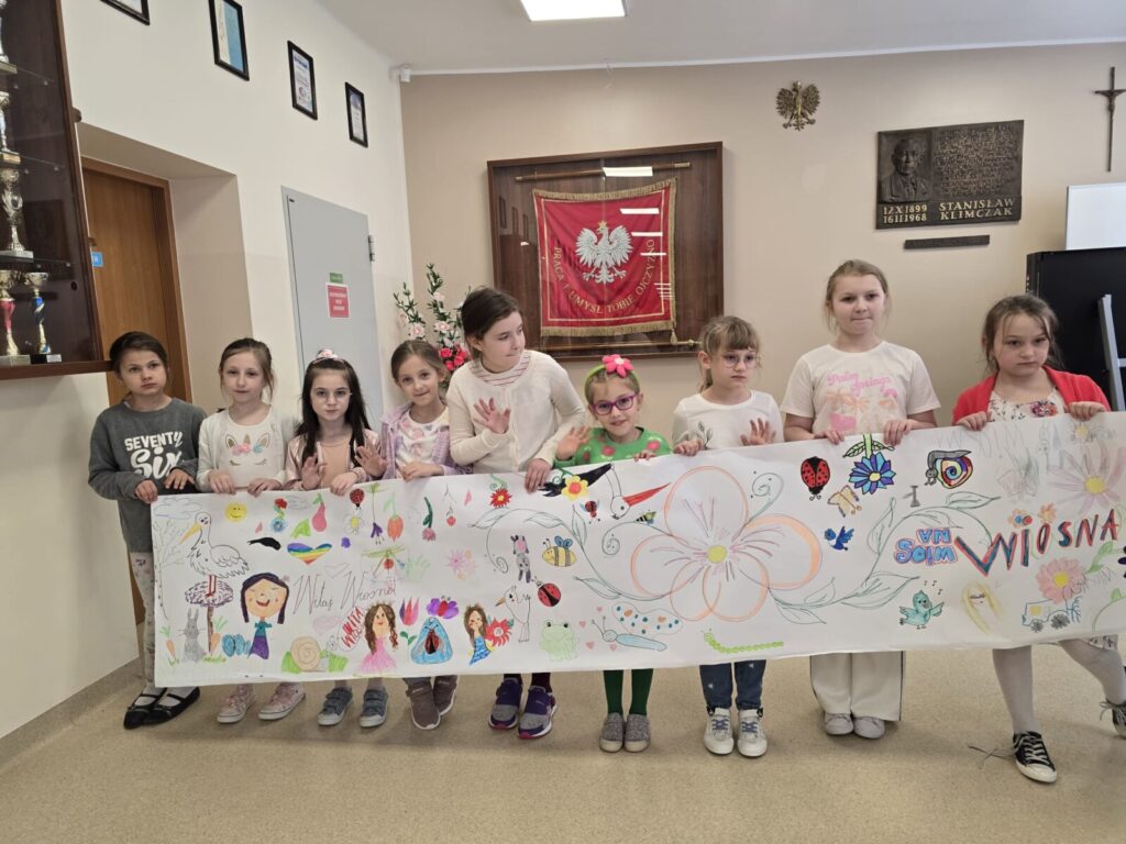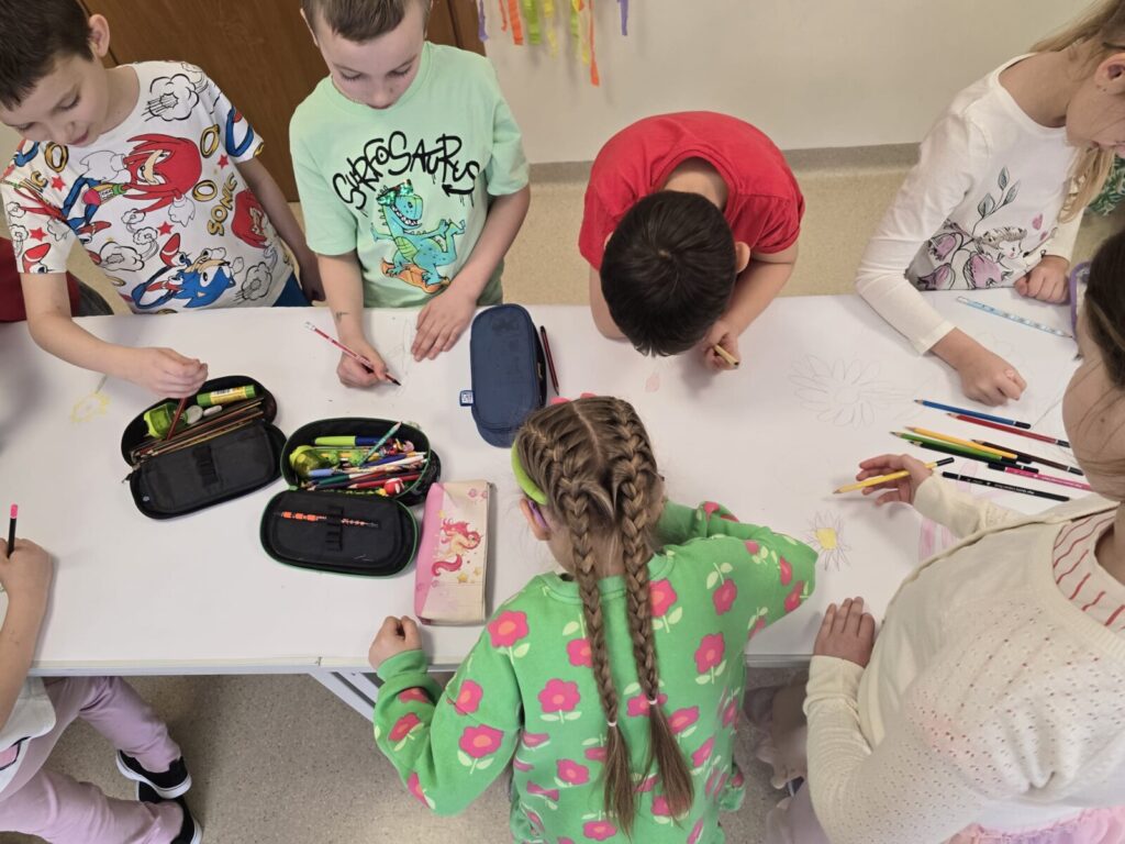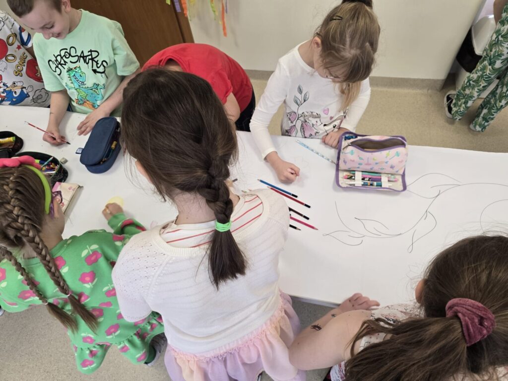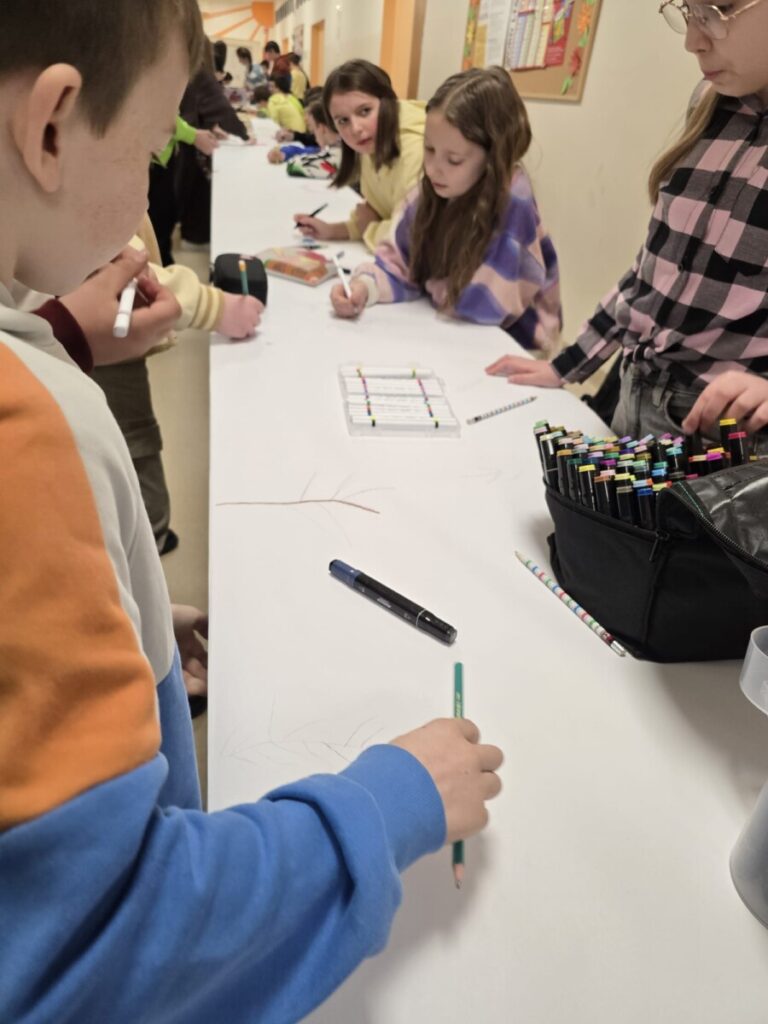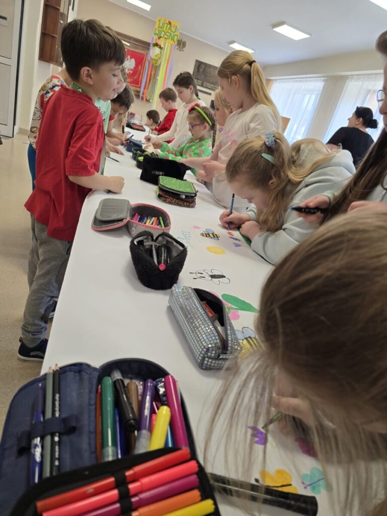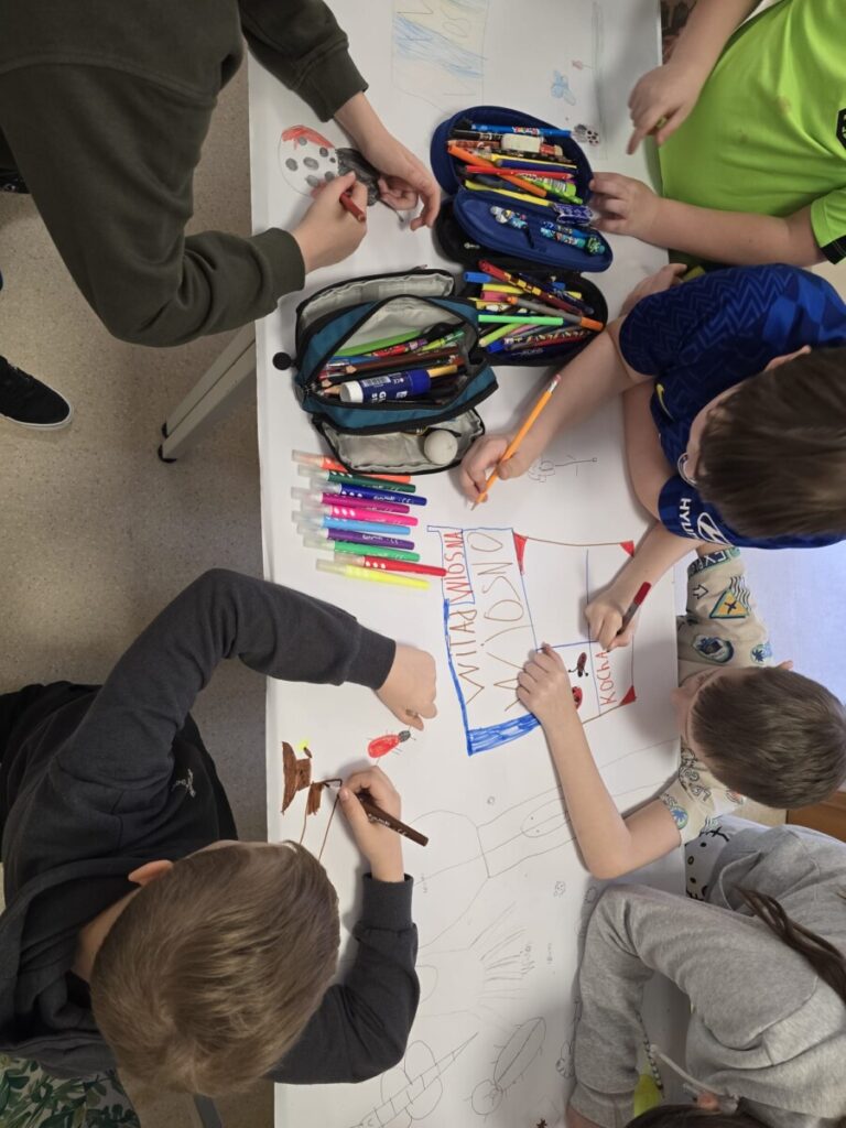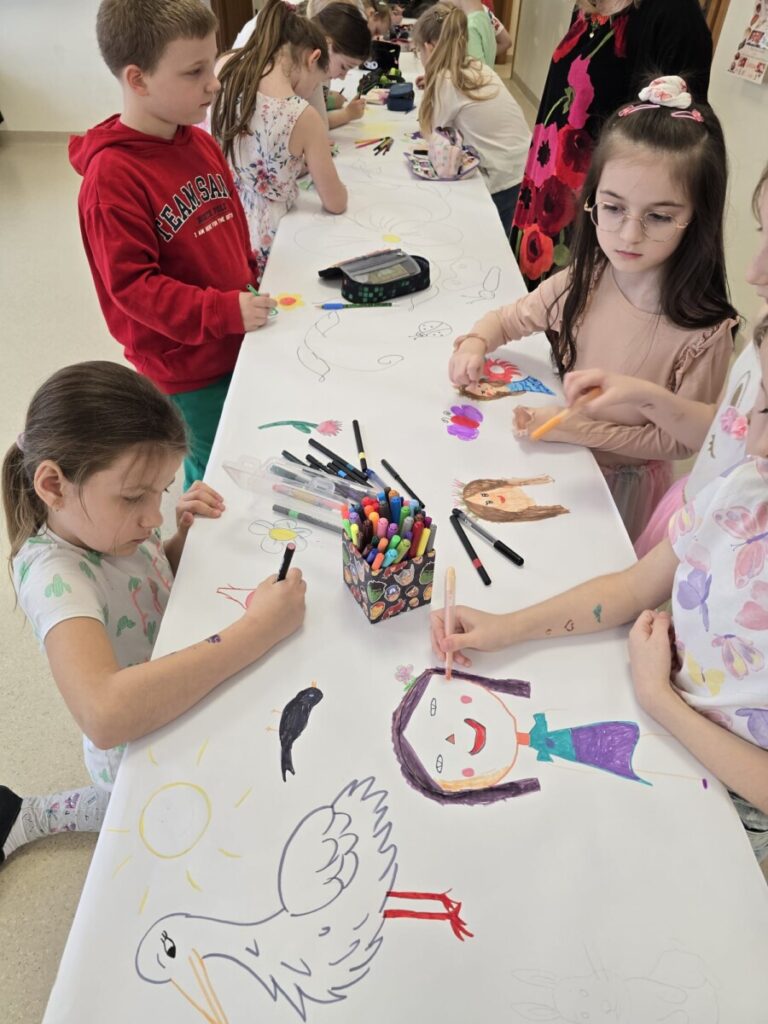 Na uczniów czekało wiele atrakcji. Jedną z nich było wspólne tworzenie wielkoformatowego rysunku na długim arkuszu papieru rozłożonym na korytarzu. Każdy mógł dołożyć coś od siebie – pojawiały się kwiaty, słońce, motyle i zielone krajobrazy. Powstało prawdziwe dzieło sztuki, które symbolizowało nadejście wiosny i naszą kreatywność.