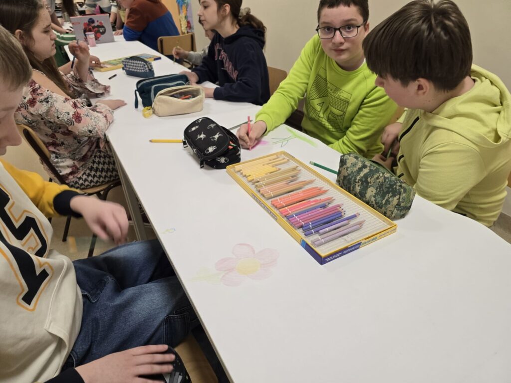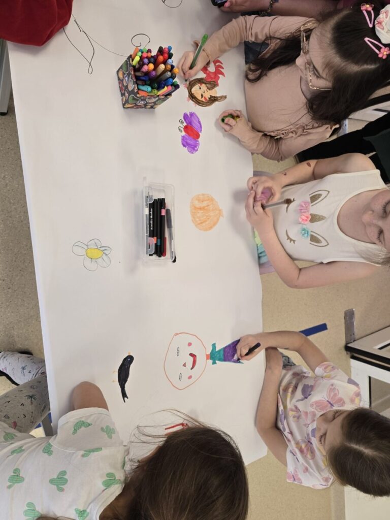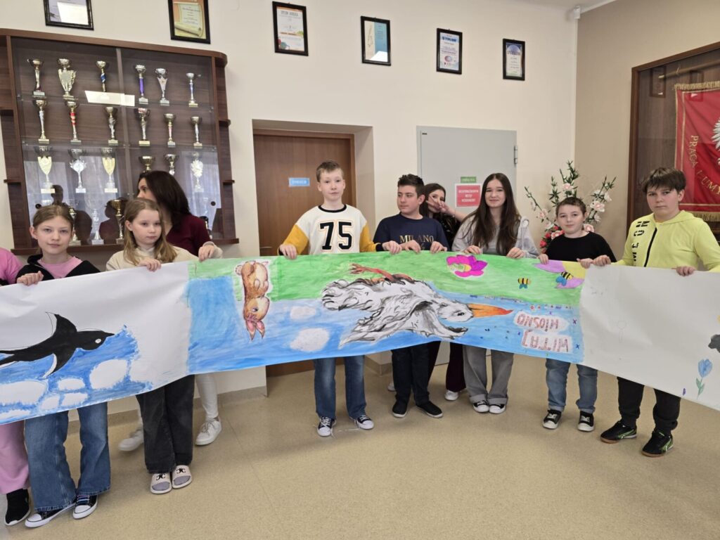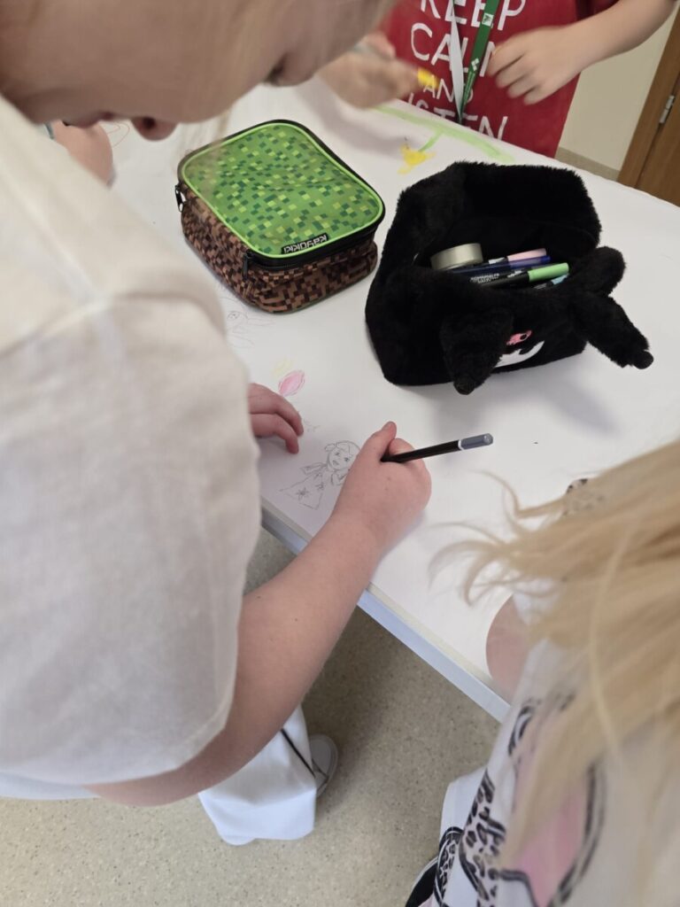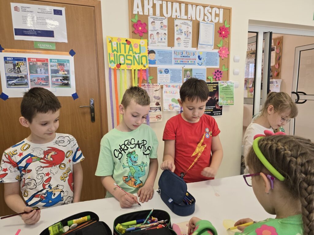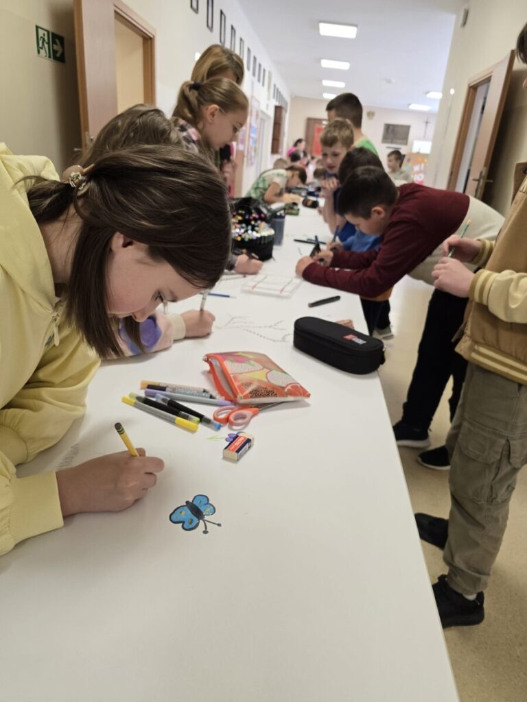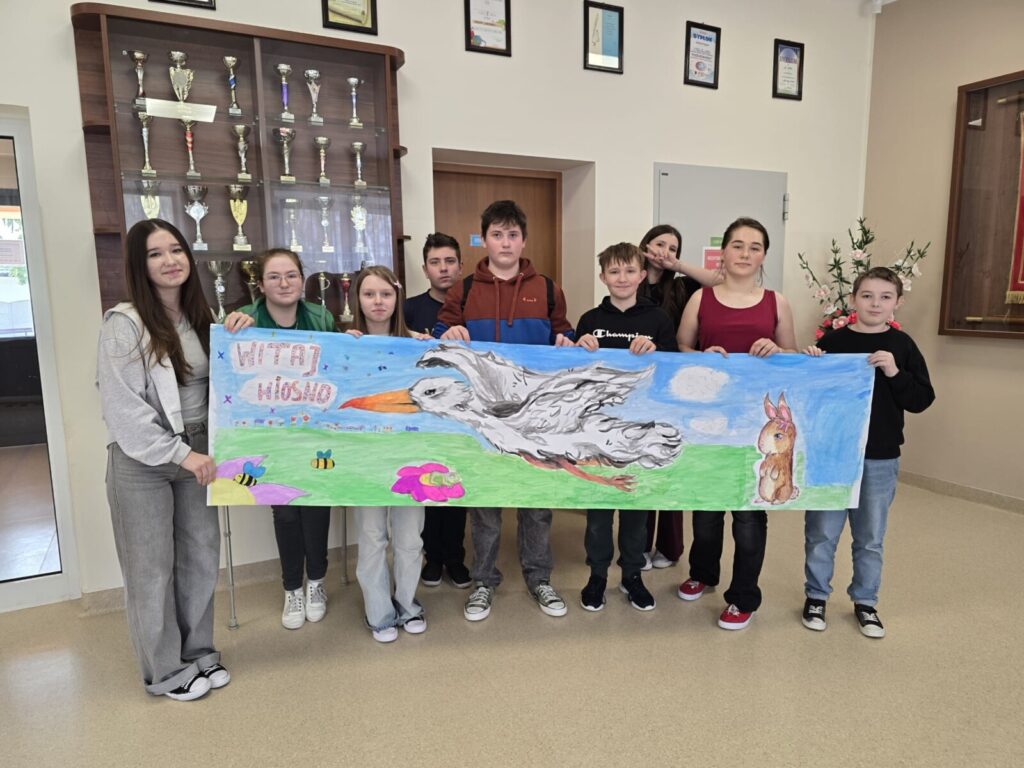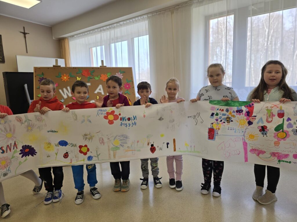 Na uczniów czekało wiele atrakcji. Jedną z nich było wspólne tworzenie wielkoformatowego rysunku na długim arkuszu papieru rozłożonym na korytarzu. Każdy mógł dołożyć coś od siebie – pojawiały się kwiaty, słońce, motyle i zielone krajobrazy. Powstało prawdziwe dzieło sztuki, które symbolizowało nadejście wiosny i naszą kreatywność.