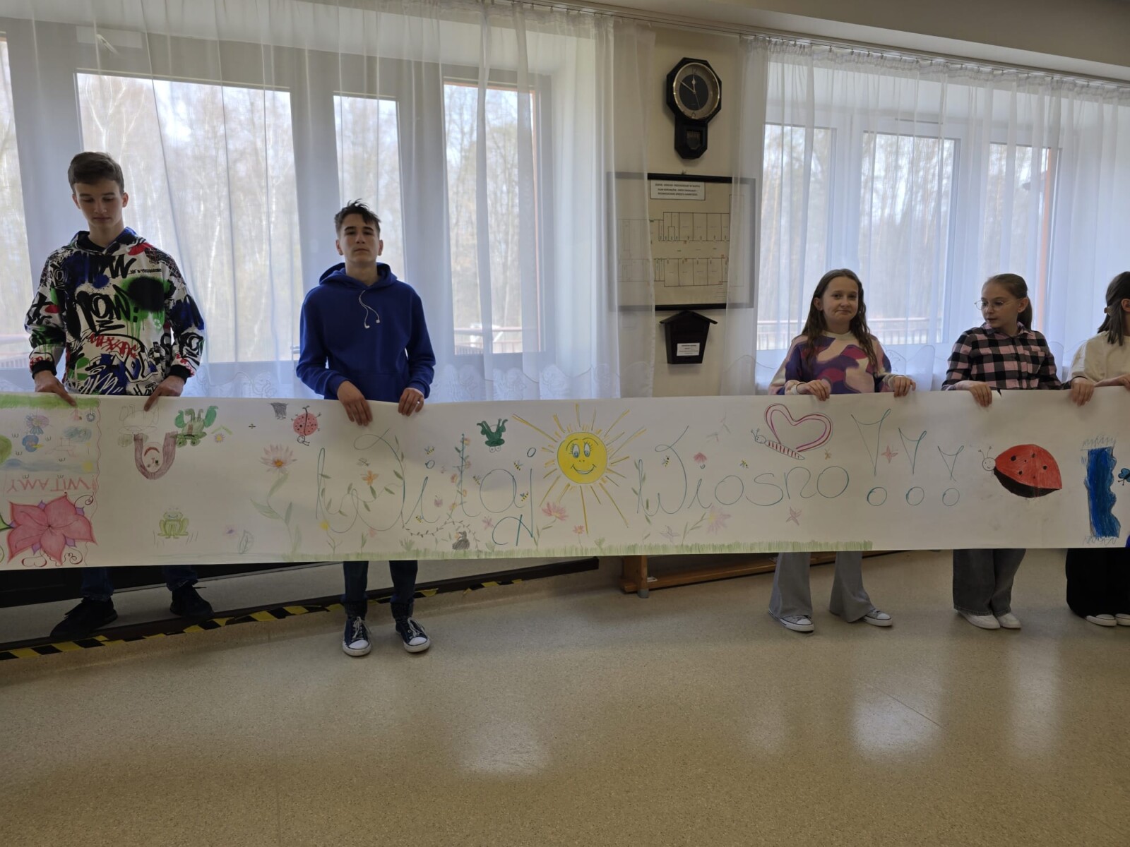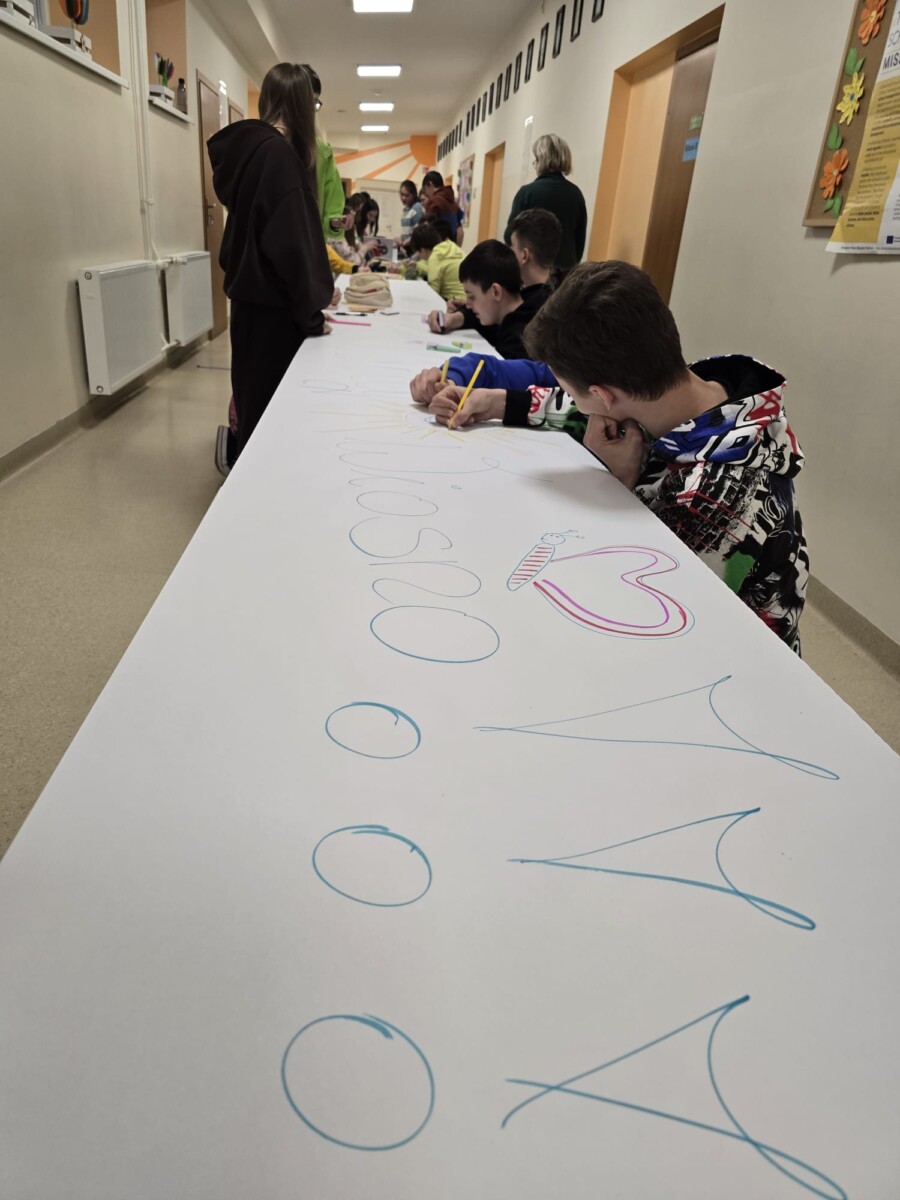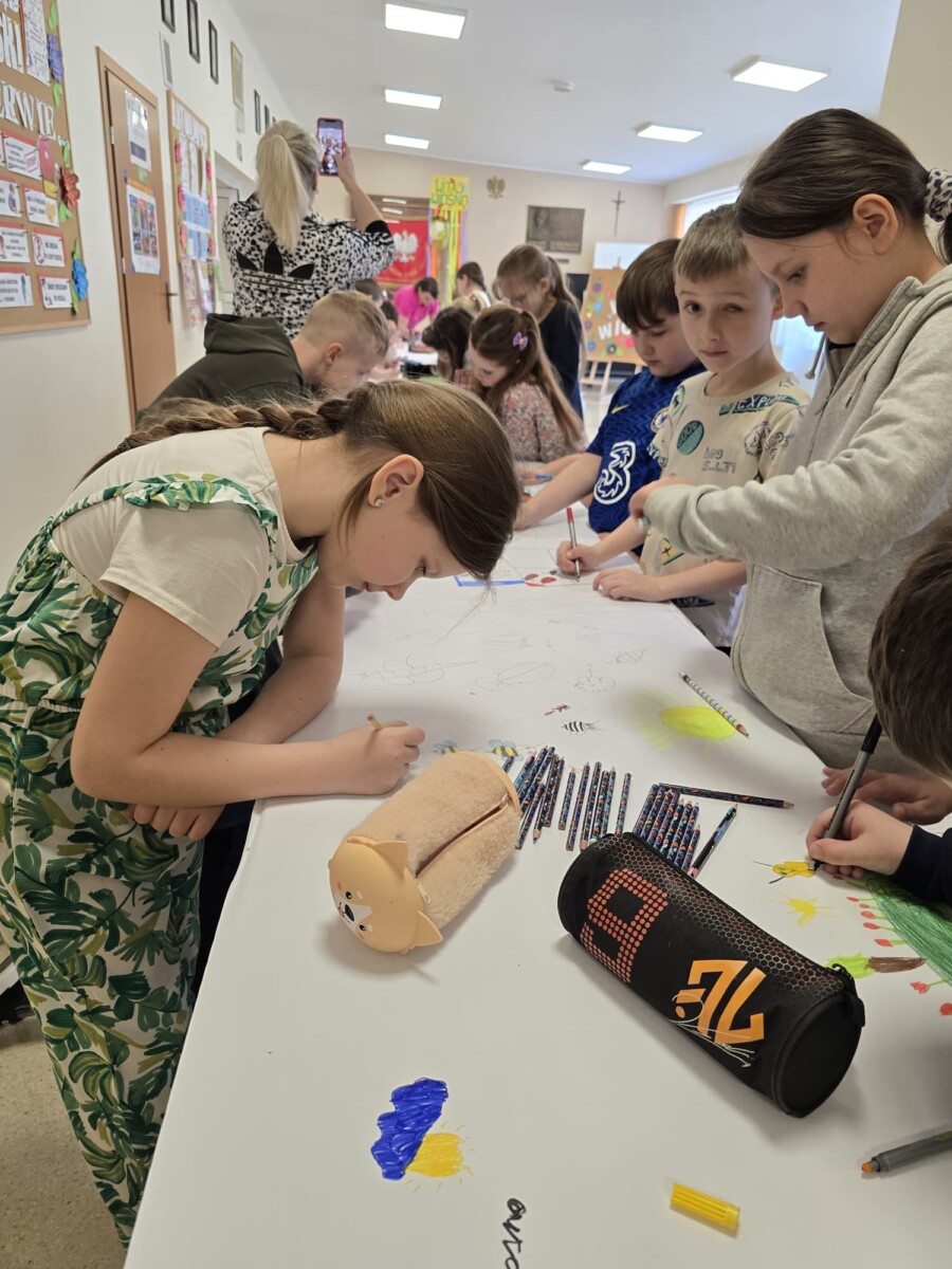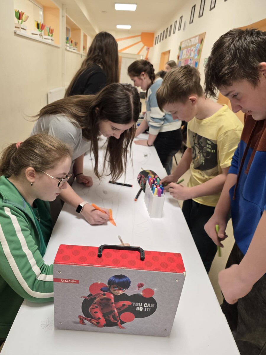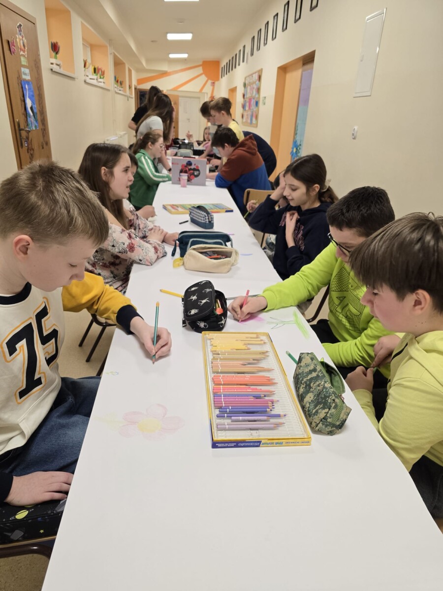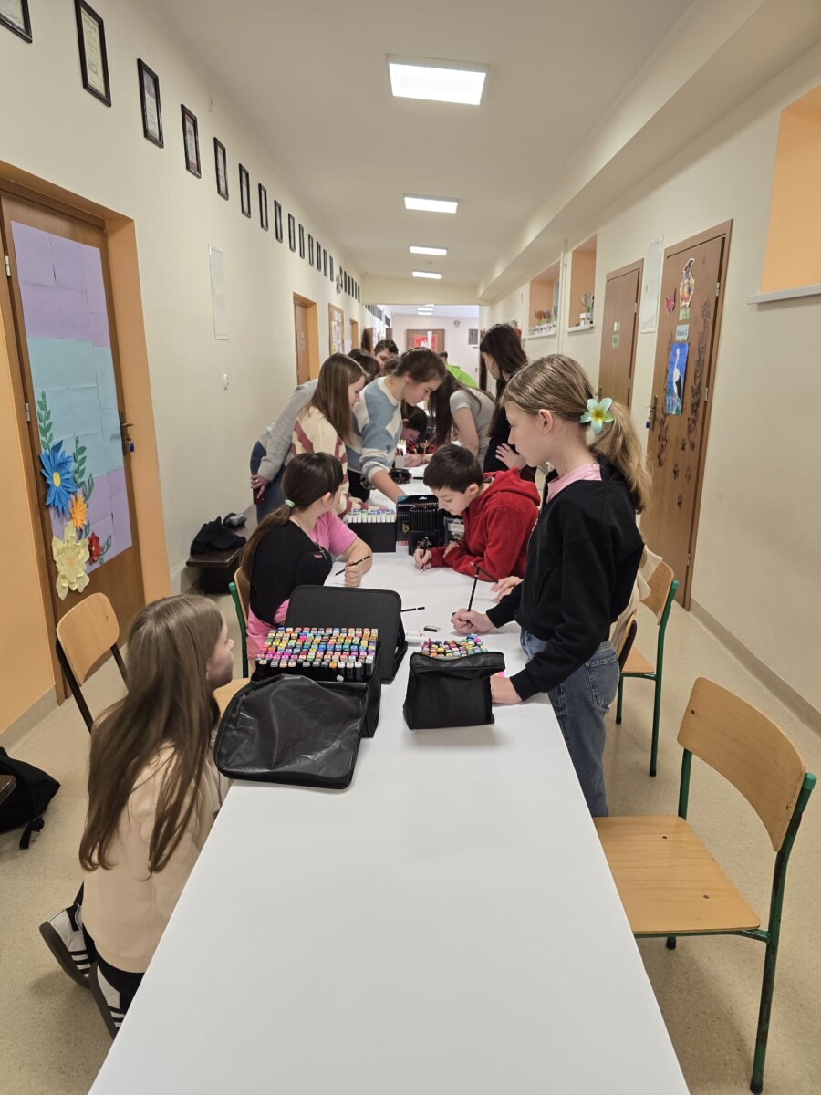 Na uczniów czekało wiele atrakcji. Jedną z nich było wspólne tworzenie wielkoformatowego rysunku na długim arkuszu papieru rozłożonym na korytarzu. Każdy mógł dołożyć coś od siebie – pojawiały się kwiaty, słońce, motyle i zielone krajobrazy. Powstało prawdziwe dzieło sztuki, które symbolizowało nadejście wiosny i naszą kreatywność.
