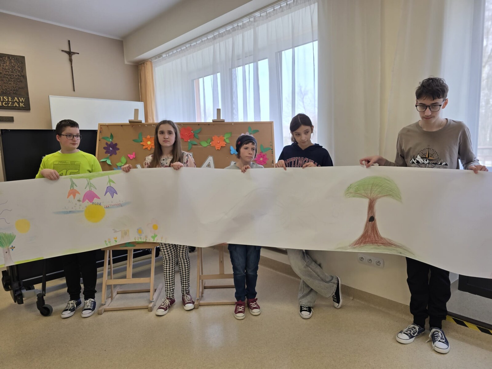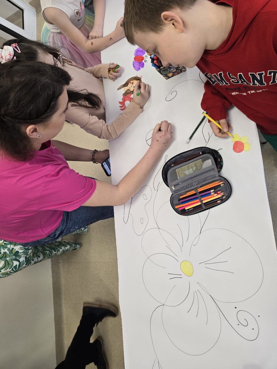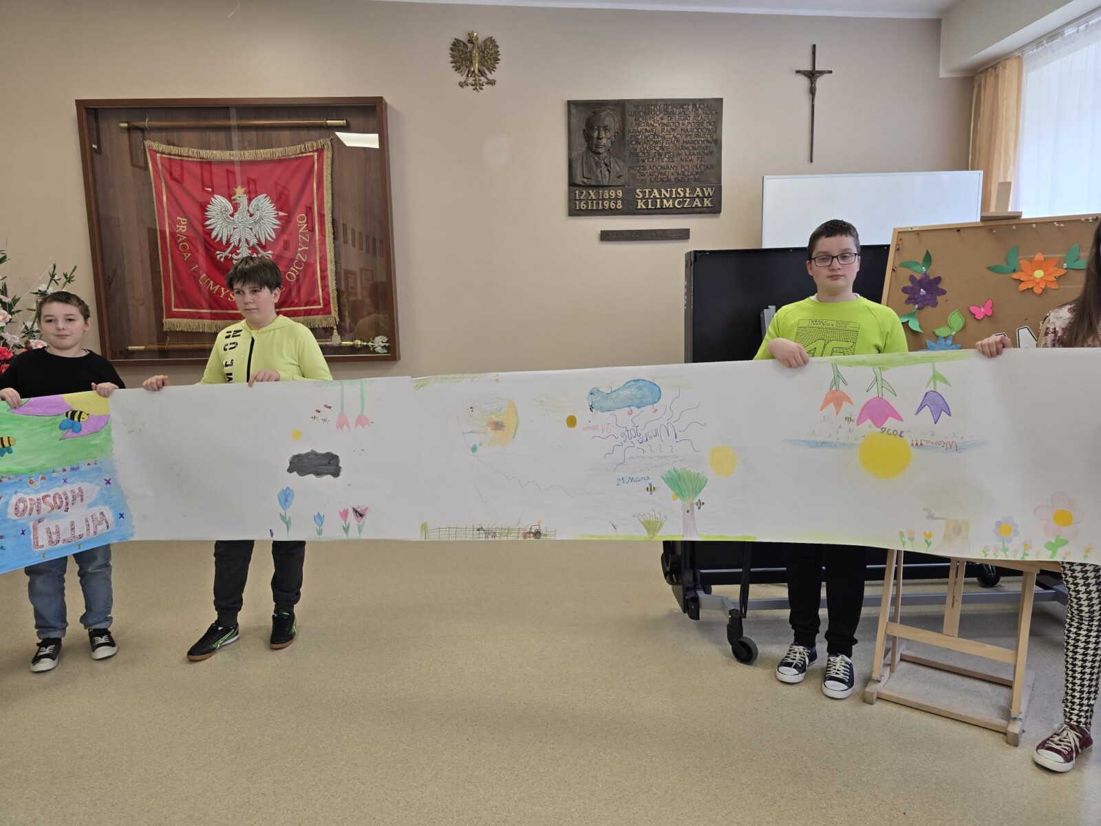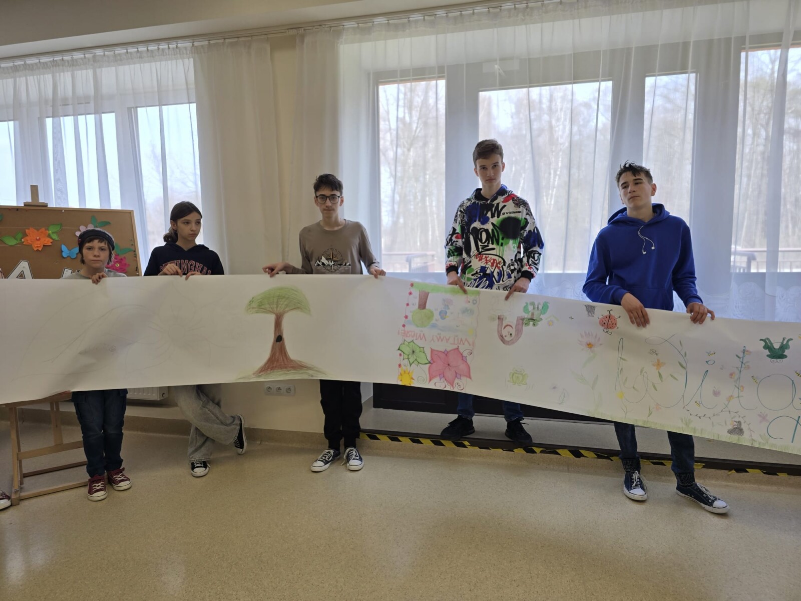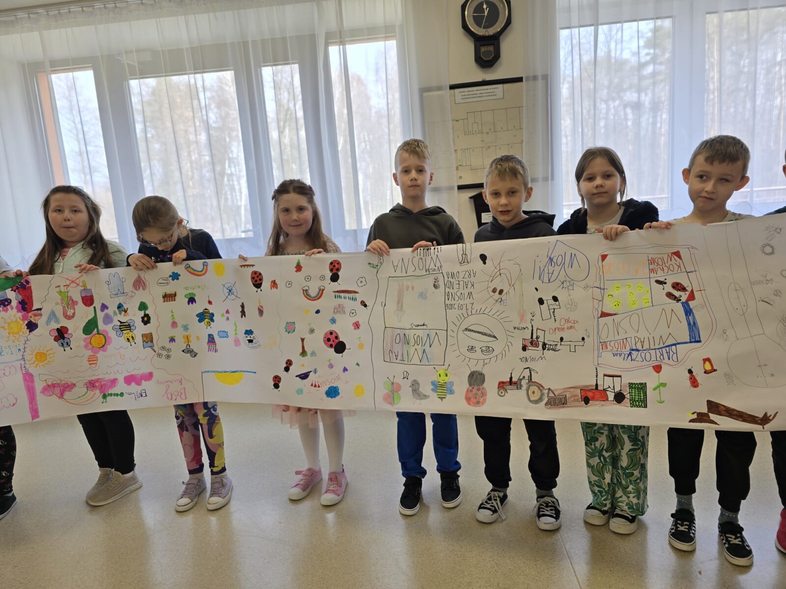 Na uczniów czekało wiele atrakcji. Jedną z nich było wspólne tworzenie wielkoformatowego rysunku na długim arkuszu papieru rozłożonym na korytarzu. Każdy mógł dołożyć coś od siebie – pojawiały się kwiaty, słońce, motyle i zielone krajobrazy. Powstało prawdziwe dzieło sztuki, które symbolizowało nadejście wiosny i naszą kreatywność.