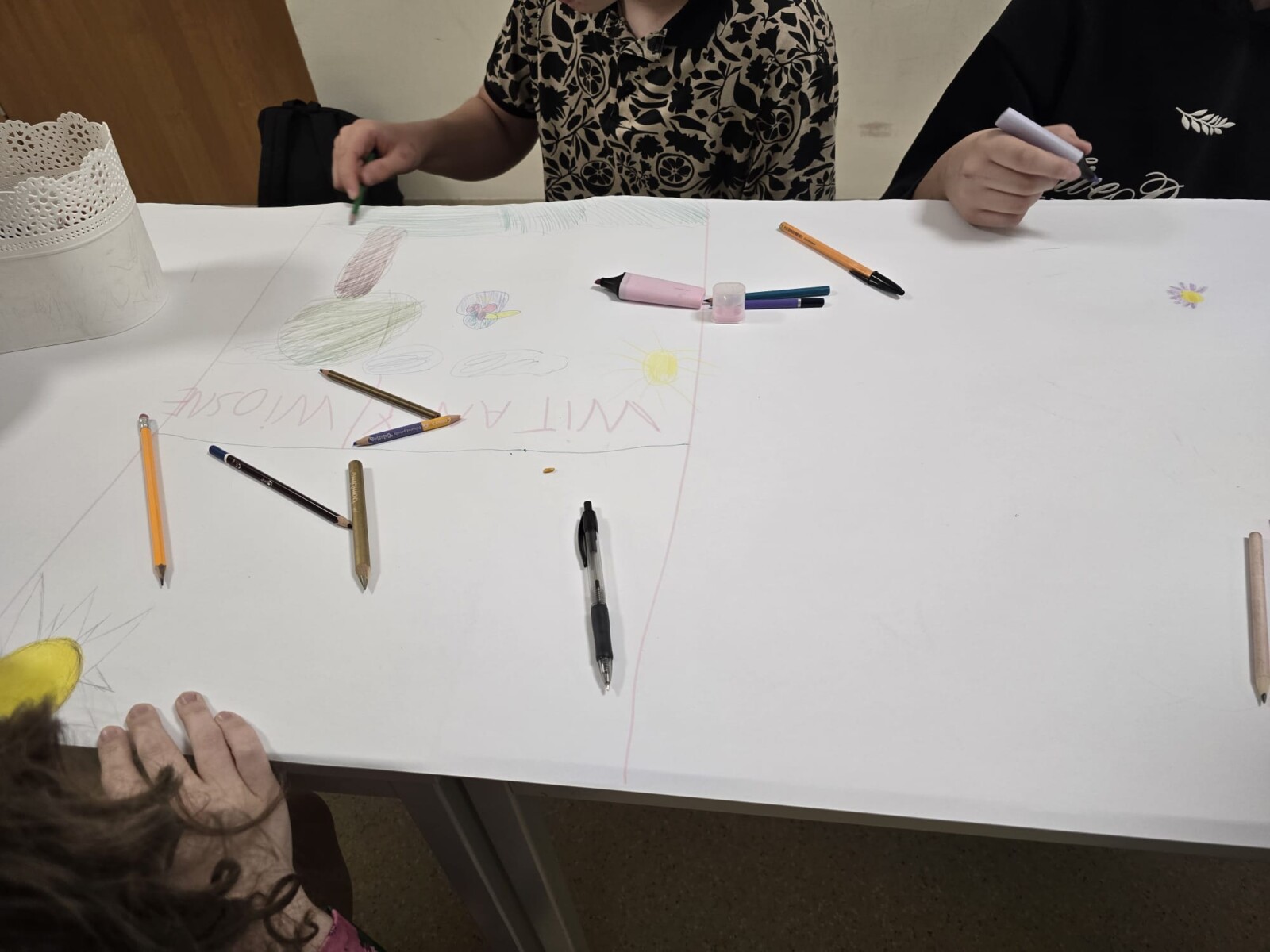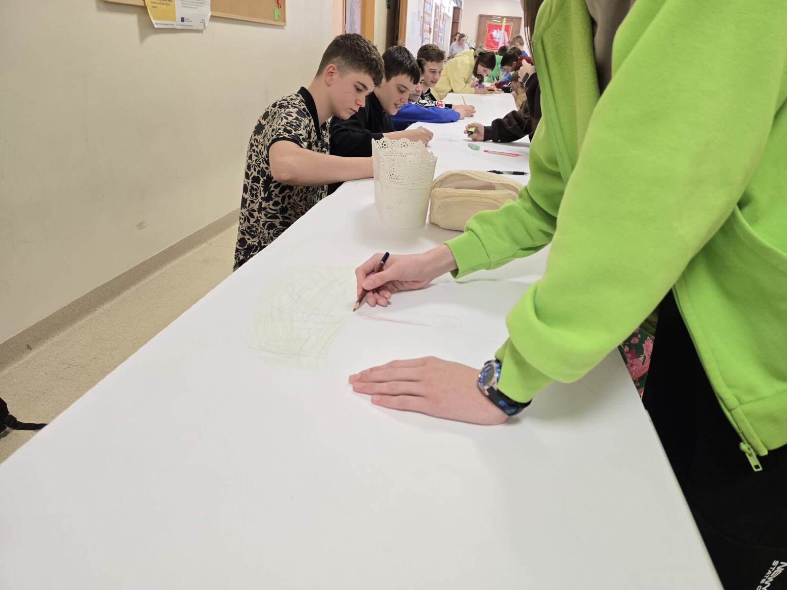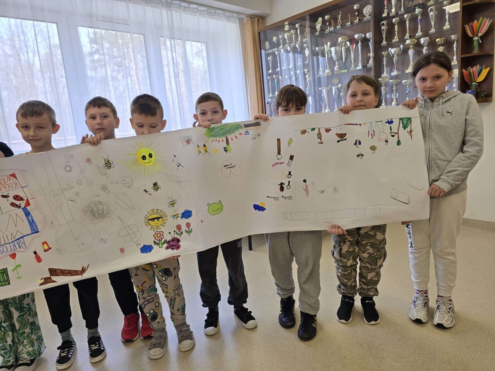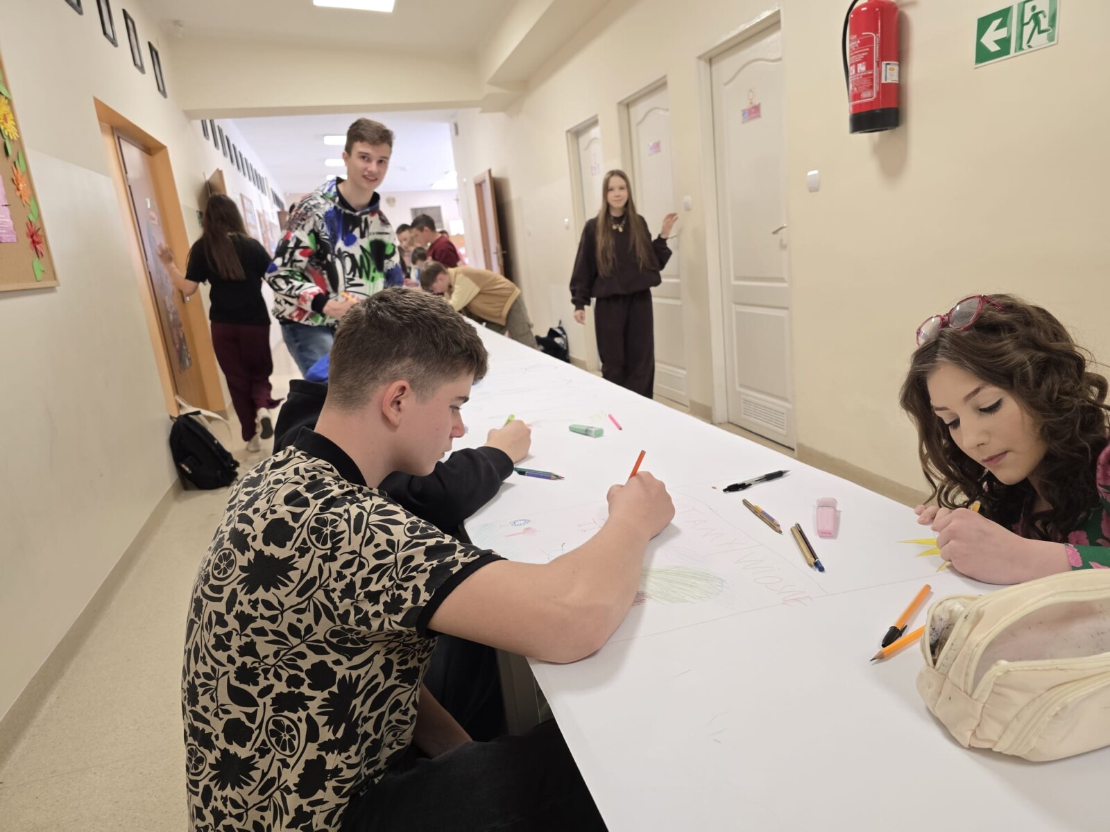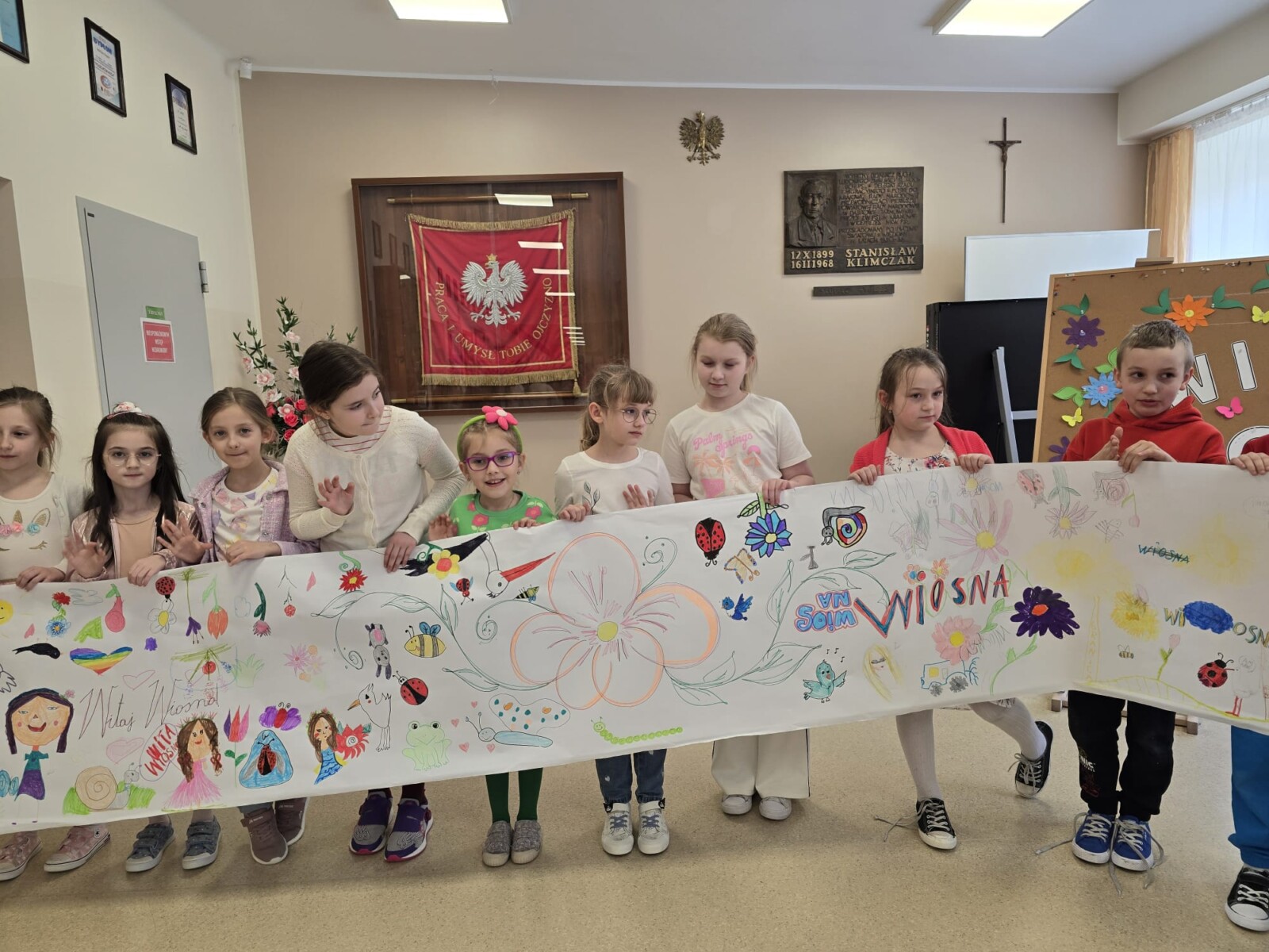 Na uczniów czekało wiele atrakcji. Jedną z nich było wspólne tworzenie wielkoformatowego rysunku na długim arkuszu papieru rozłożonym na korytarzu. Każdy mógł dołożyć coś od siebie – pojawiały się kwiaty, słońce, motyle i zielone krajobrazy. Powstało prawdziwe dzieło sztuki, które symbolizowało nadejście wiosny i naszą kreatywność.