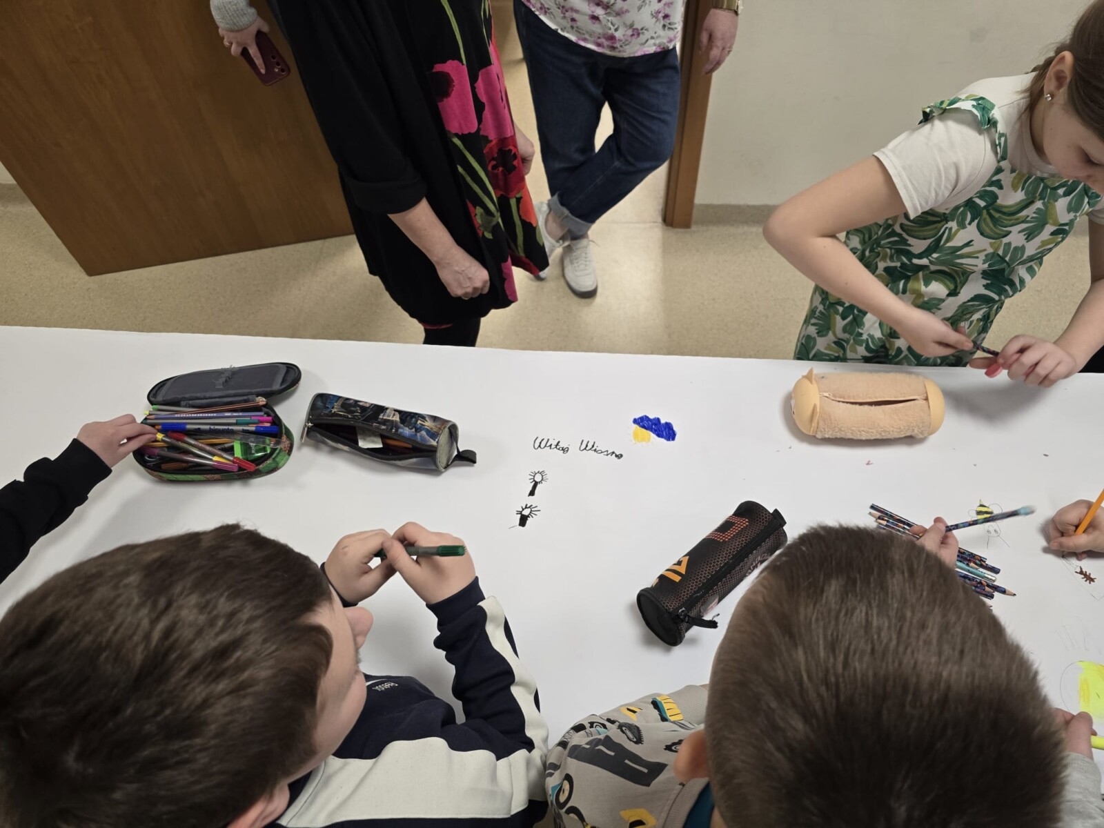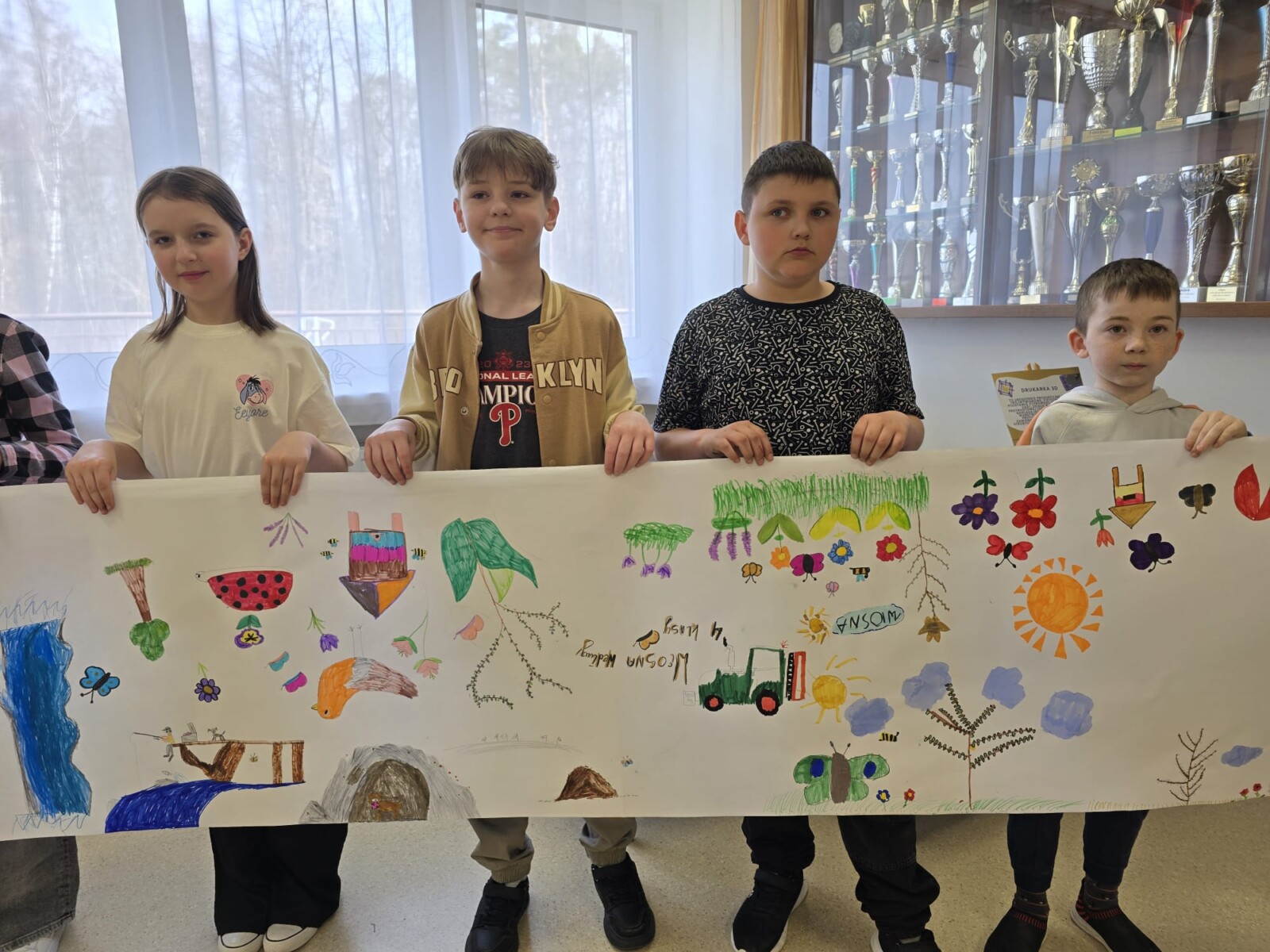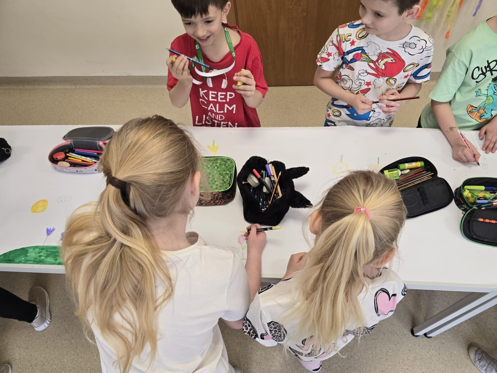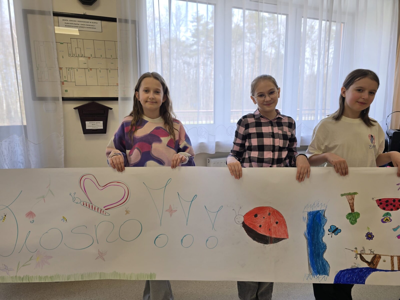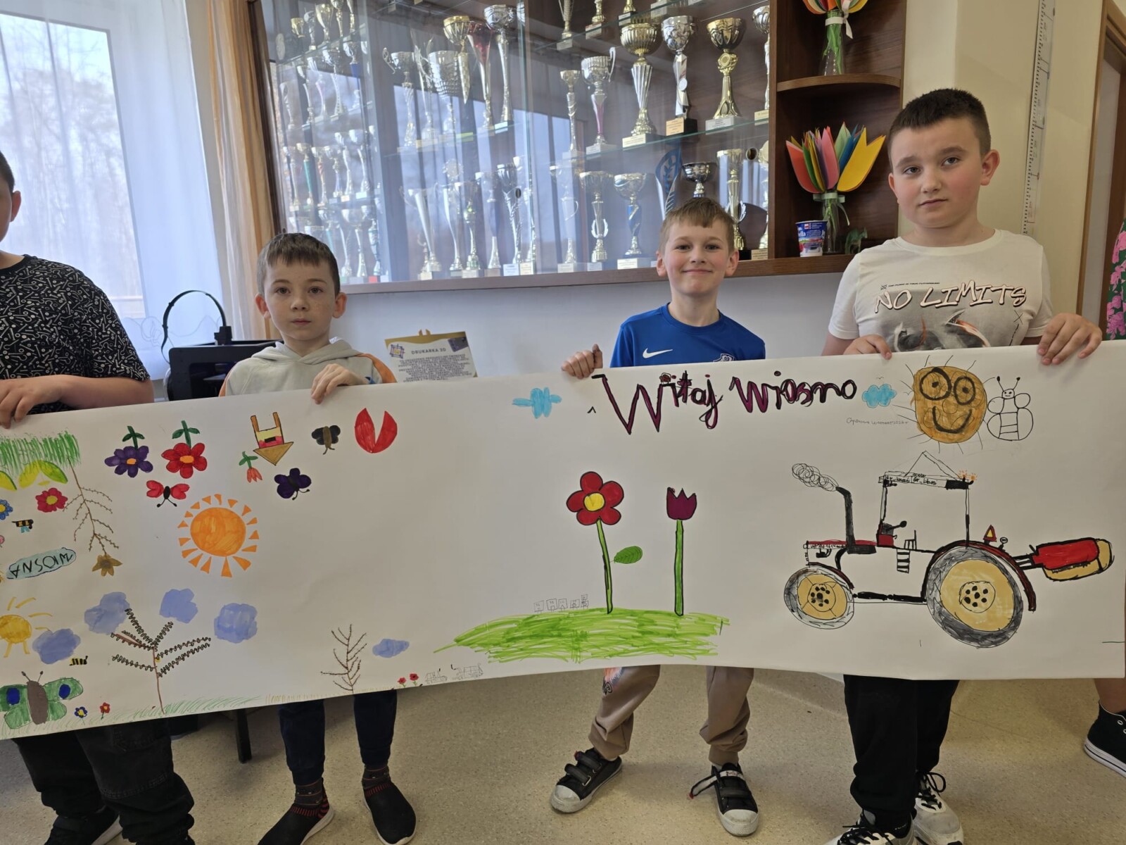 Na uczniów czekało wiele atrakcji. Jedną z nich było wspólne tworzenie wielkoformatowego rysunku na długim arkuszu papieru rozłożonym na korytarzu. Każdy mógł dołożyć coś od siebie – pojawiały się kwiaty, słońce, motyle i zielone krajobrazy. Powstało prawdziwe dzieło sztuki, które symbolizowało nadejście wiosny i naszą kreatywność.