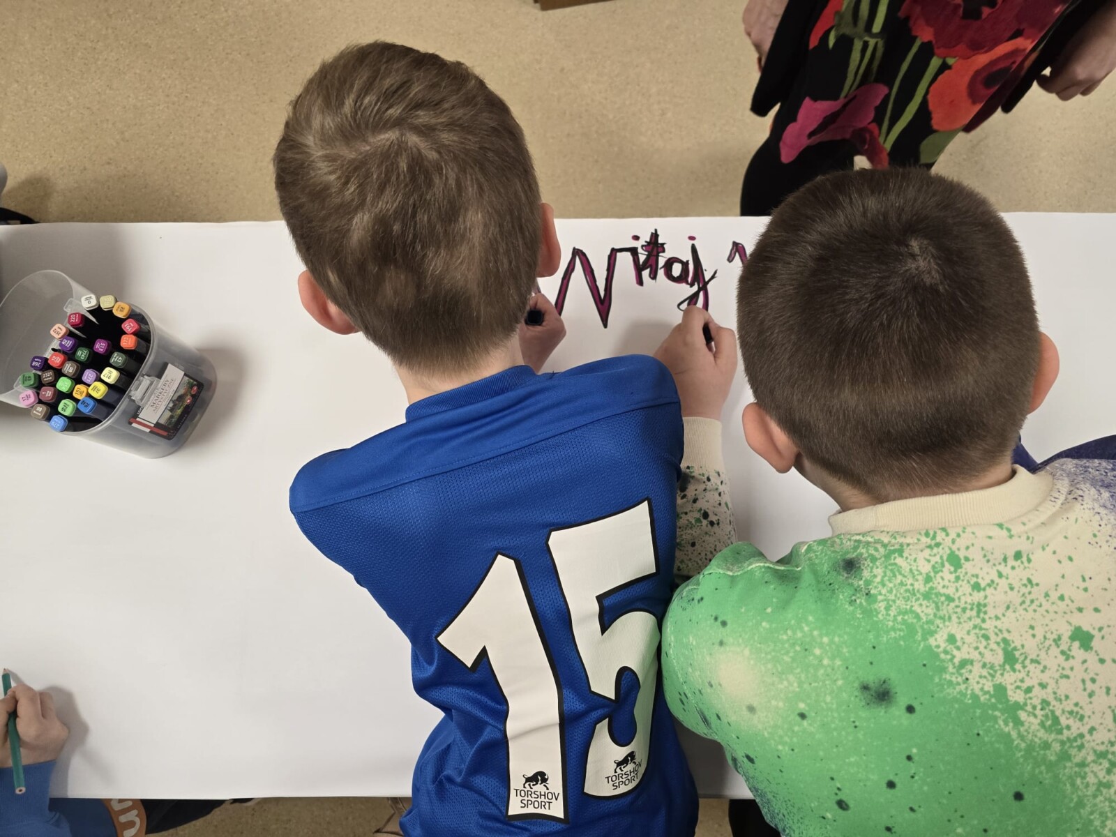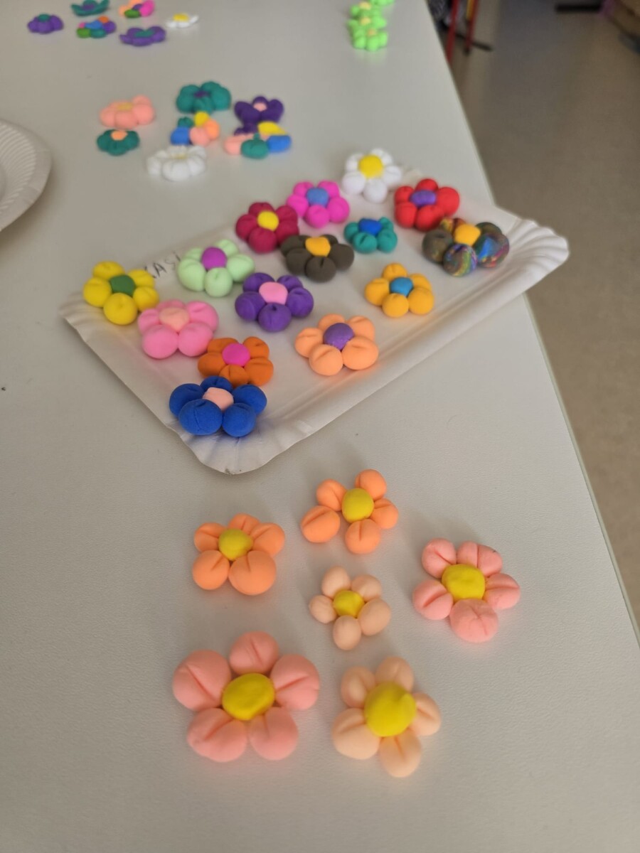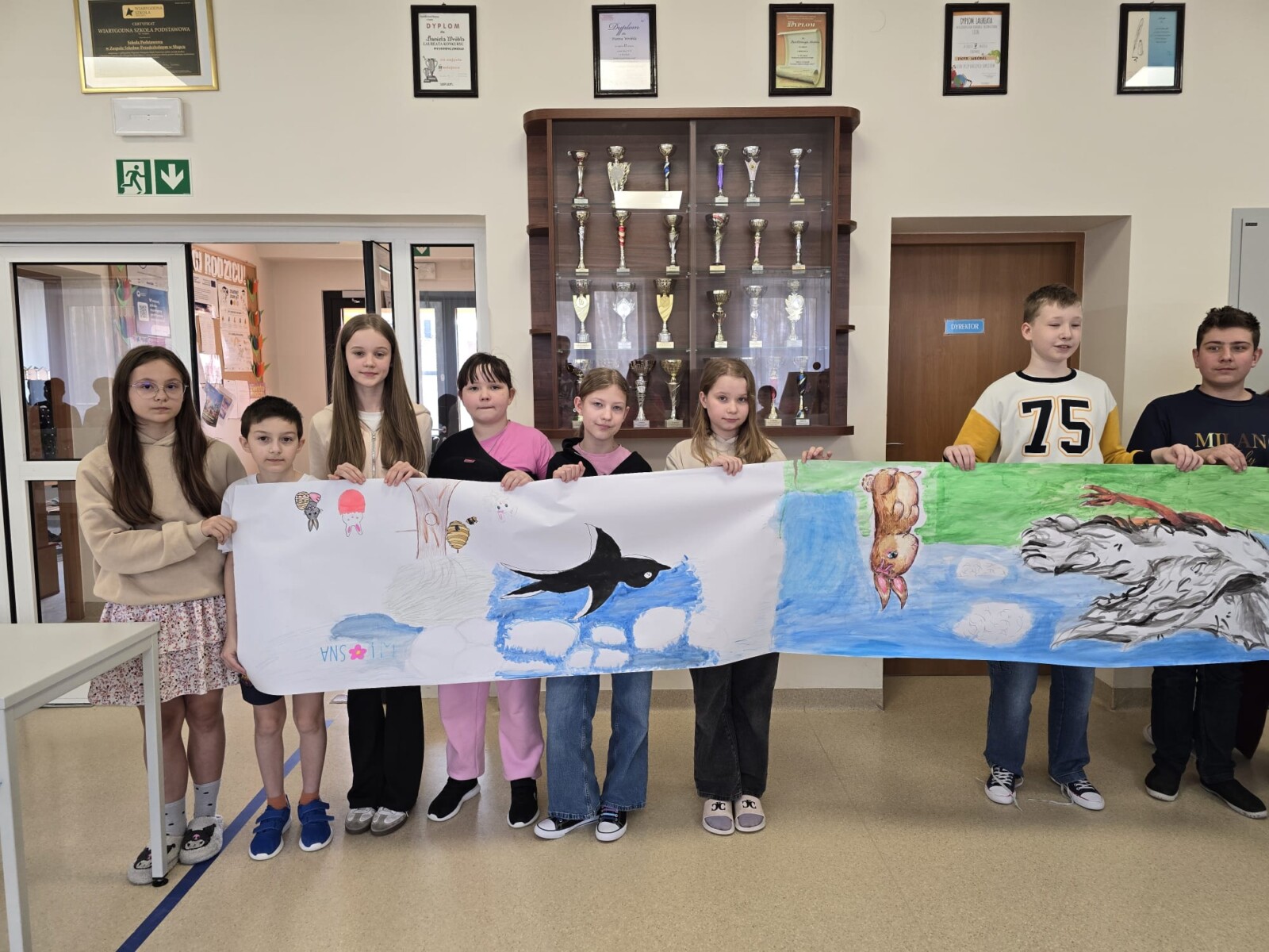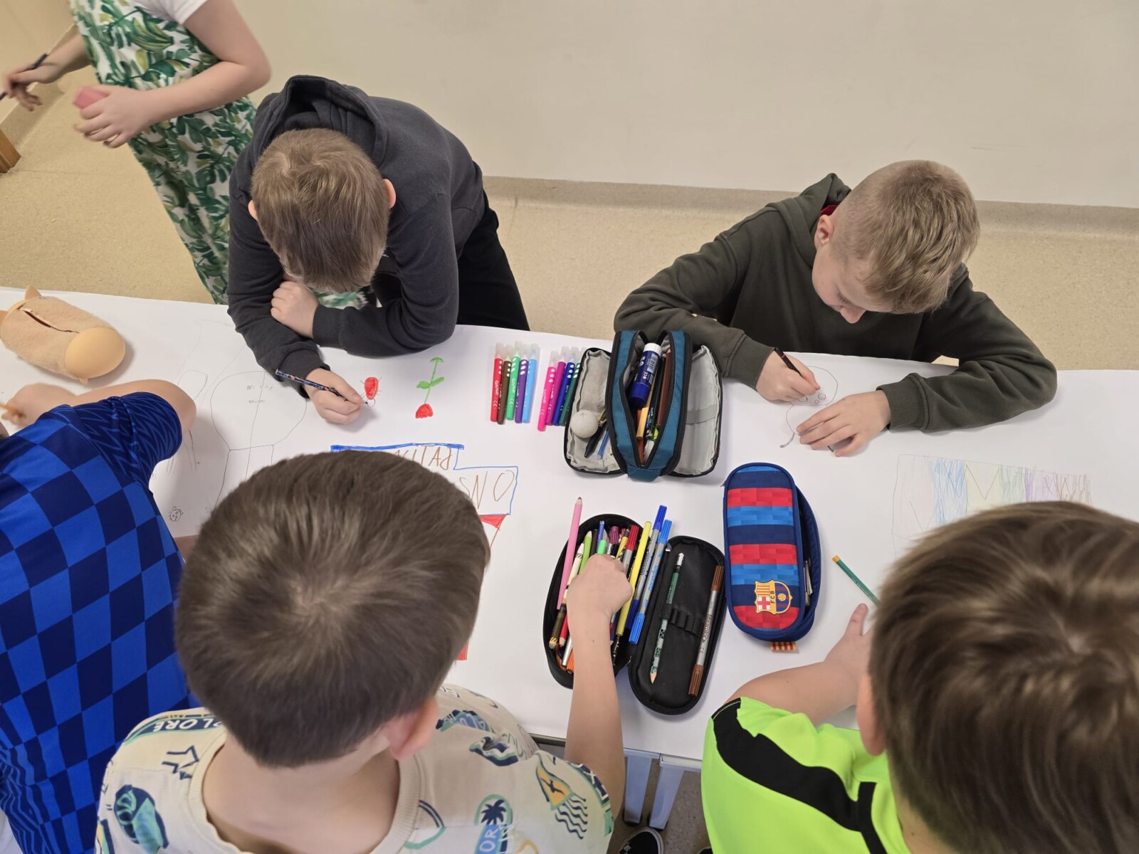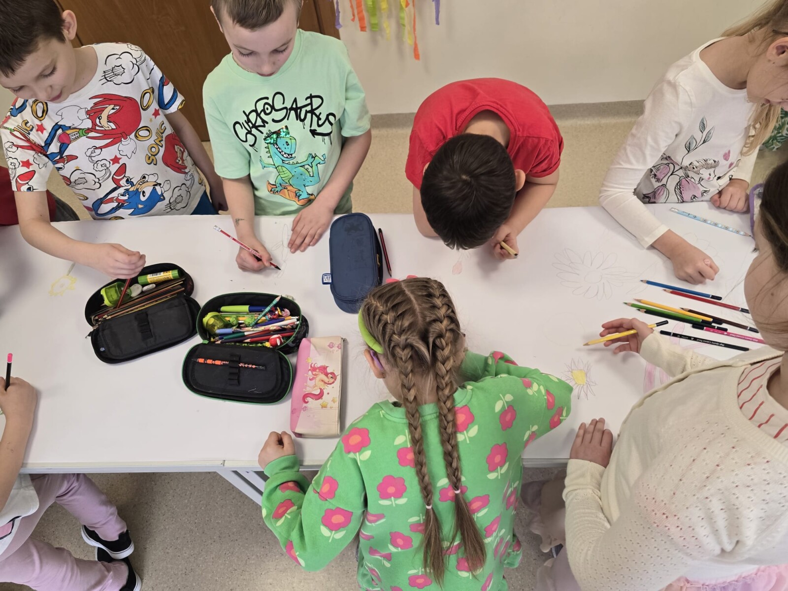 Na uczniów czekało wiele atrakcji. Jedną z nich było wspólne tworzenie wielkoformatowego rysunku na długim arkuszu papieru rozłożonym na korytarzu. Każdy mógł dołożyć coś od siebie – pojawiały się kwiaty, słońce, motyle i zielone krajobrazy. Powstało prawdziwe dzieło sztuki, które symbolizowało nadejście wiosny i naszą kreatywność.