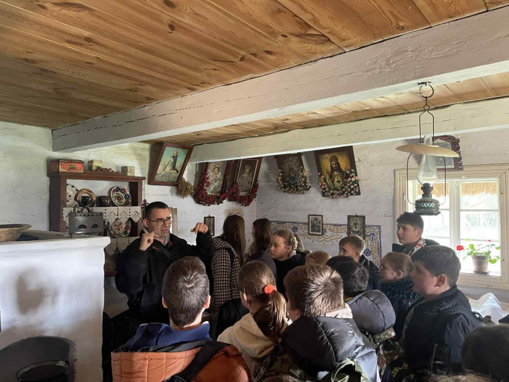 Podczas zwiedzania uczniowie poznali warunki życia na wsi w dawnych czasach: zobaczyli, jak wyglądały prace gospodarskie, jakie narzędzia wykorzystywano w polu i w gospodarstwie, a także jak funkcjonowały tradycyjne rzemiosła. Była to niezwykła lekcja historii, pozwalająca zrozumieć, jak wyglądało życie bez elektroniki – w rytmie natury i w bliskości z ziemią.